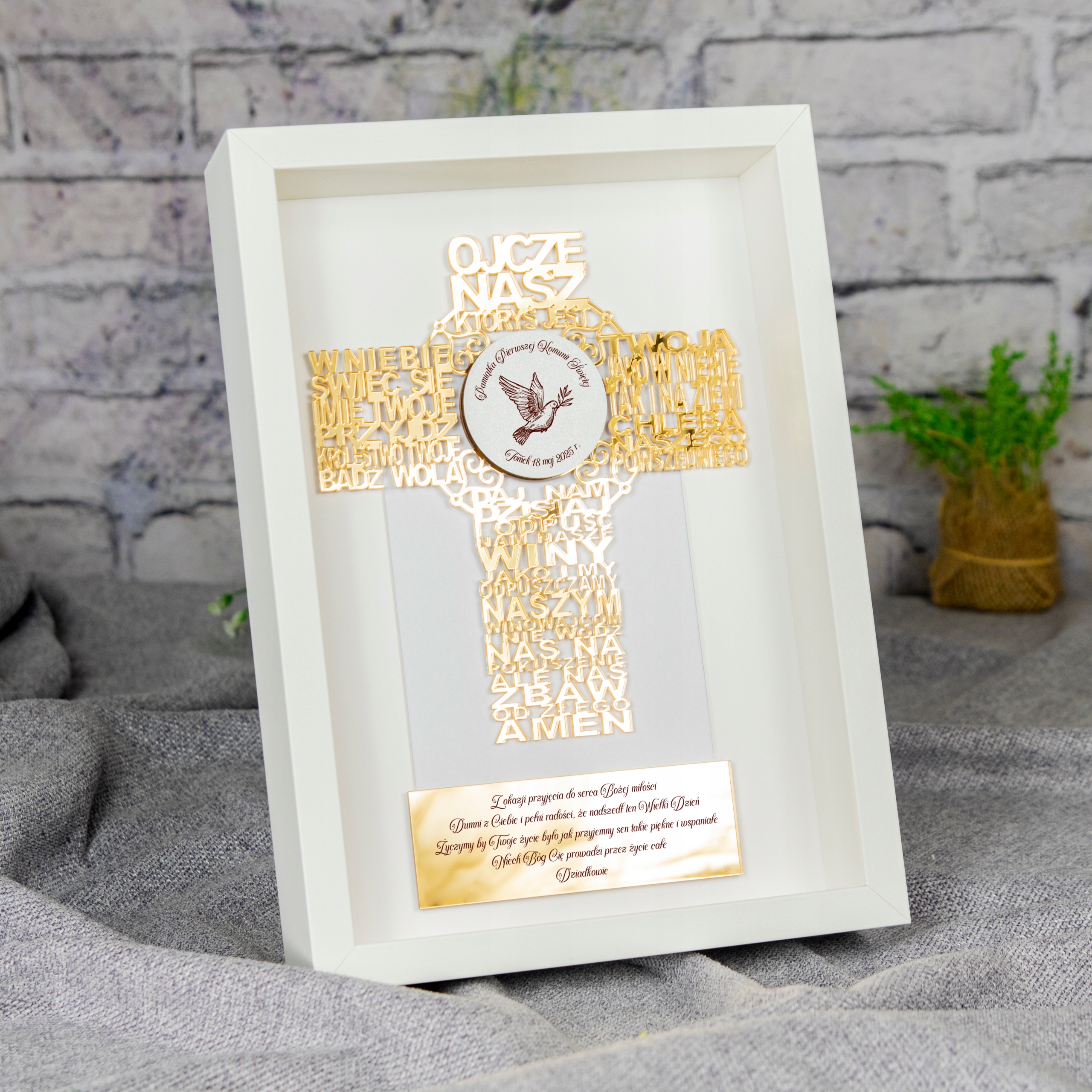 Стильная картина с молитвой «Наш Отец», расположенная в форме креста, заключенной в глубокую декоративную рамку, является вечным даром с духовным персонажем. Благодаря внимательному исполнению и уходу за подробностями, он станет не только сувениром, но и украшением любого интерьера.