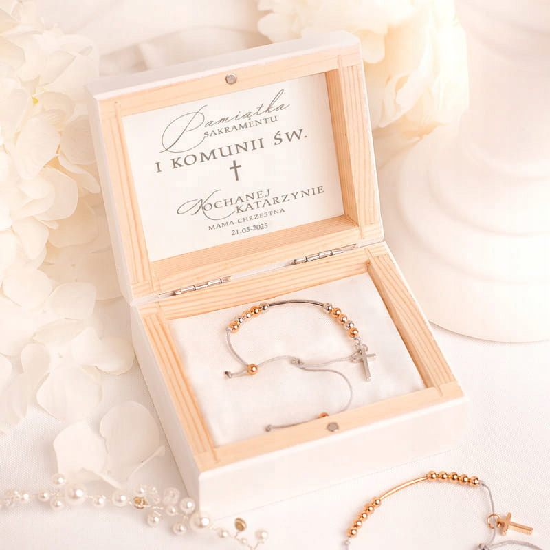 Сувенир причастия в виде коробочки с элегантным браслетом с декадой четок. Уникальный подарок для ребенка, принявшего Таинство Первого Причастия. Идеальный подарок как мальчику, так и девочке, ведь браслет выполнен в универсальной цветовой гамме.