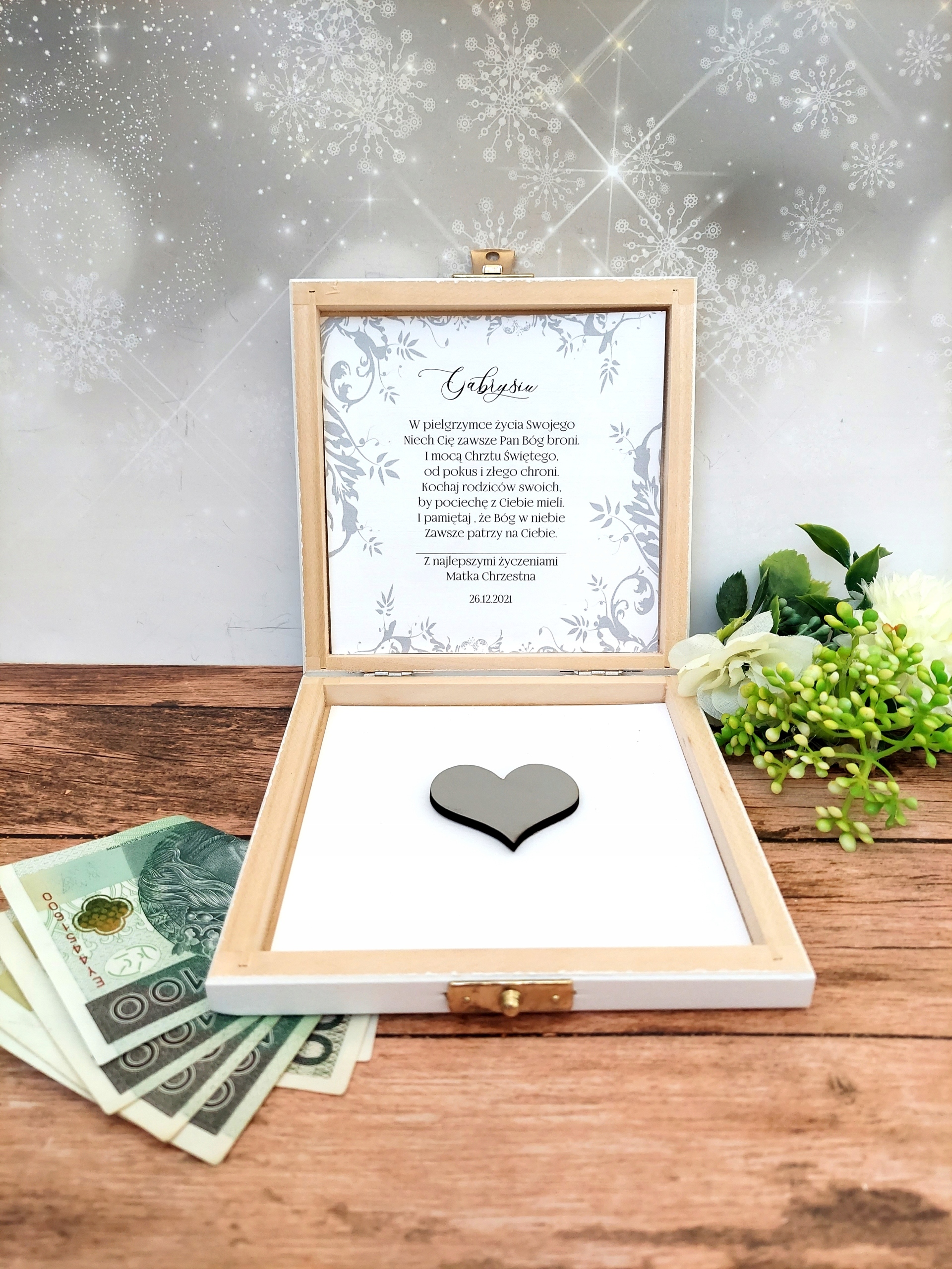 Деревянная шкатулка с индивидуальными пожеланиями и местом для денег или другого подарка.