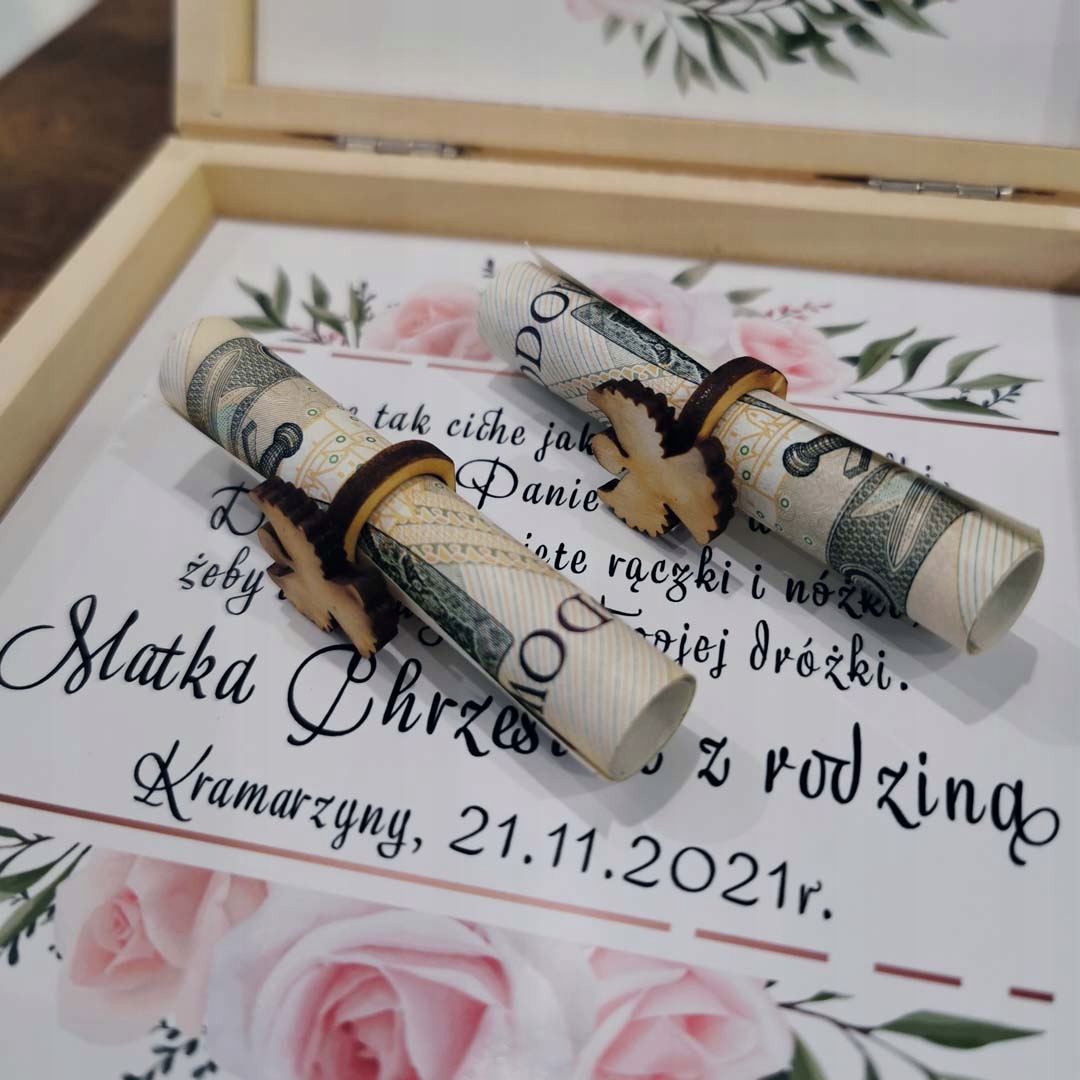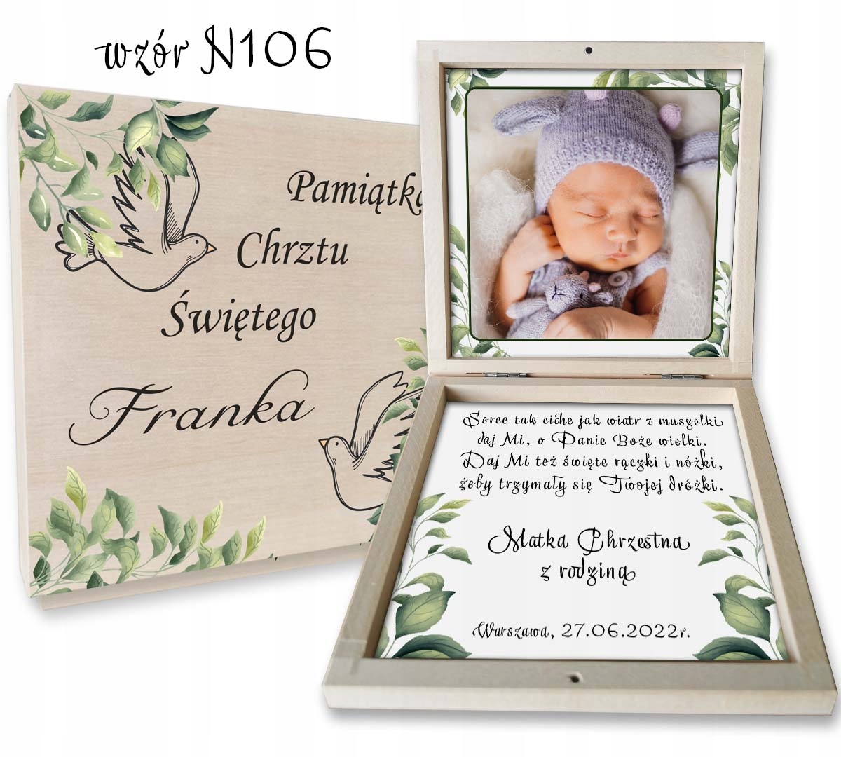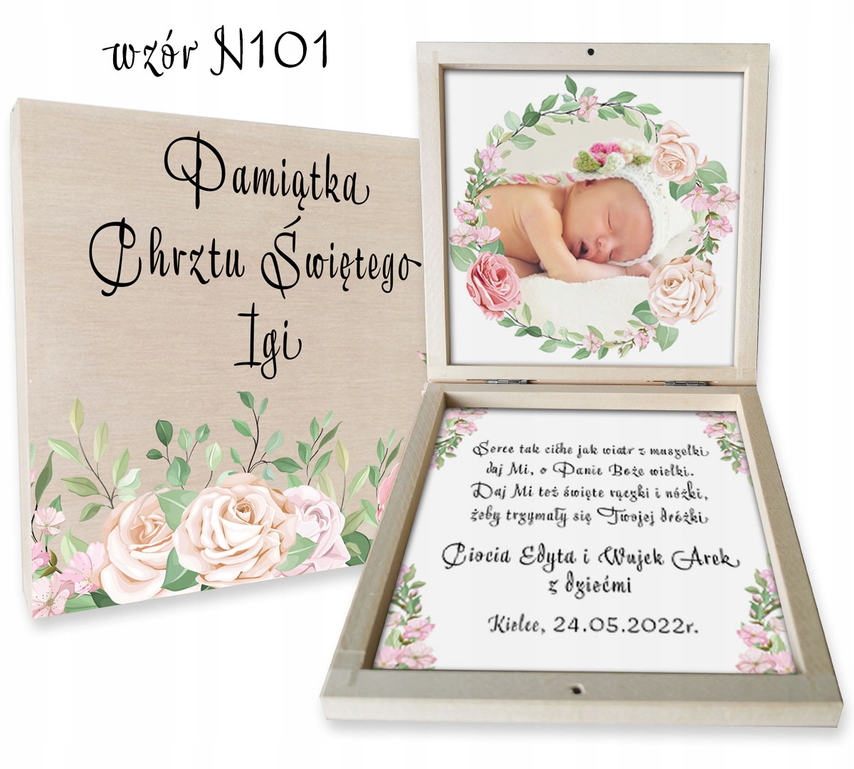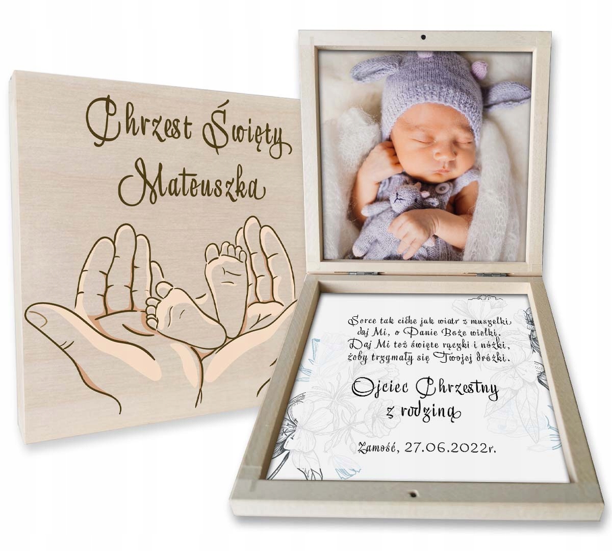 Подарок на Крещение в виде коробочки. В коробочке находится графический рисунок с фотографией ребенка и пожеланиями. На лицевую сторону коробки напечатана технология УФ-печати. Каждая персонализация готовится индивидуально для клиента. Шкатулку можно прекрасно использовать как копилку по случаю Святого Крещения. В каждую коробку добавляем по два кусочка ангелов с кольцом для размещения денег. Банкноты в коробку не входят.