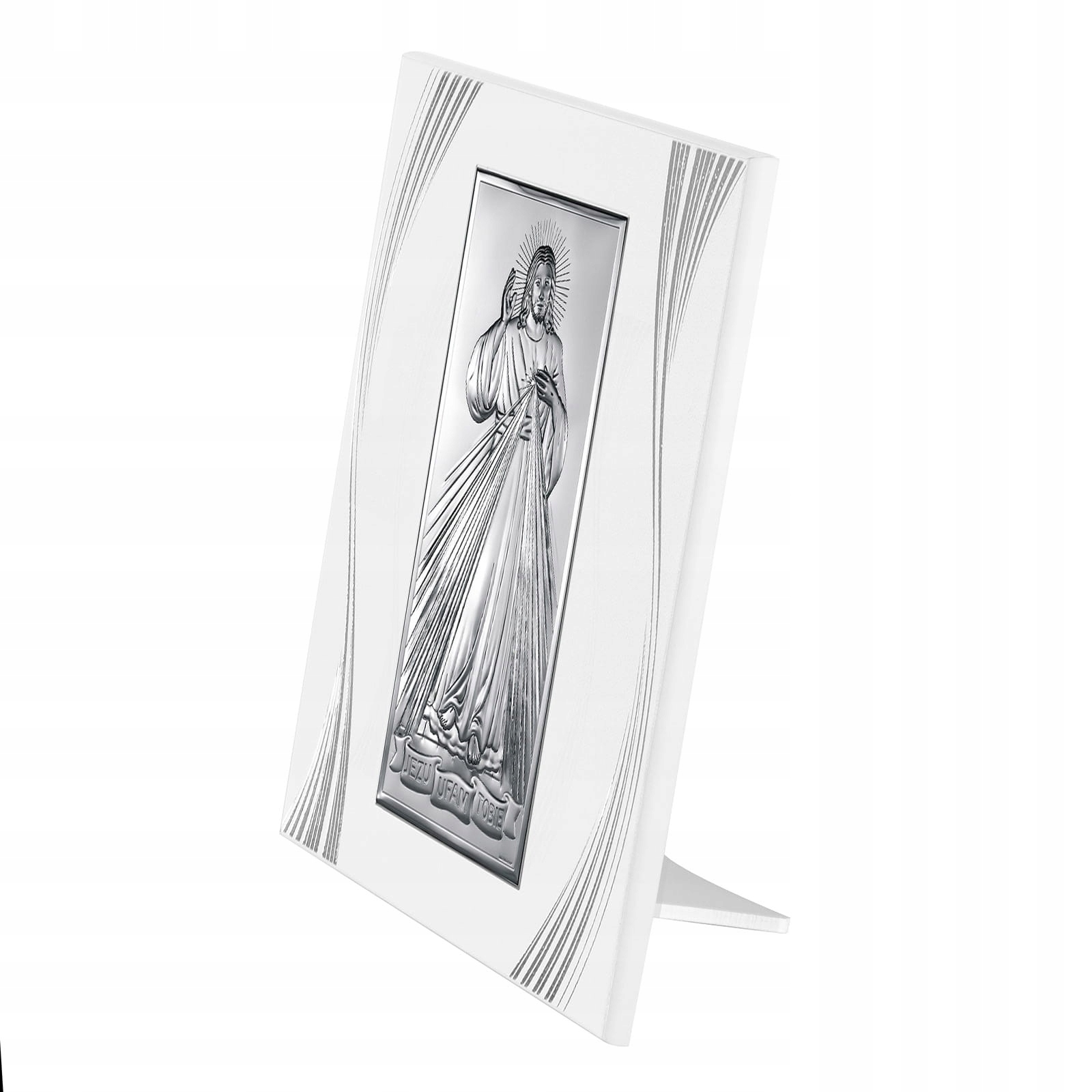 Эксклюзивная серебряная картина итальянского производства, созданная компанией-лидером по производству сувенирной серебряной продукции. На картине изображен образ Милосердного Господа Иисуса, с надписью внизу: «Иисус, на Тебя уповаю». Дополнительно все это помещено на белую декоративную панель. Картина является уникальным подарком или сувениром к особому случаю, такому как Первое причастие, Первое причастие, свадьба или годовщина свадьбы.