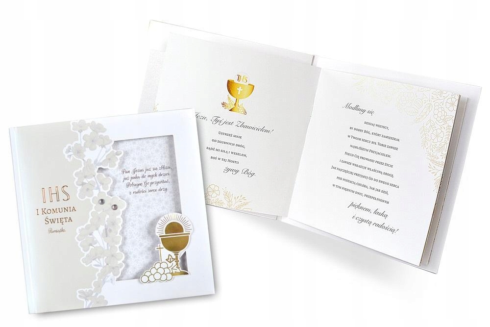 PMB Q буклет - это уникальный продукт - красиво опубликованный, элегантный, украшенный золотой и жемчужной фольгой, с красочным интерьером с красивой графикой и цитатами, а также пожеланиями и местом для личной посвящения. Специальный, маленький конверт вставлен на внутренней стороне обложки, в котором вы можете перевести подарочную карту или банкноту. Книга PMB Q Kukartka - идеальный подарок для особого случая, который, несомненно, является первым святым причастием. Празднования,