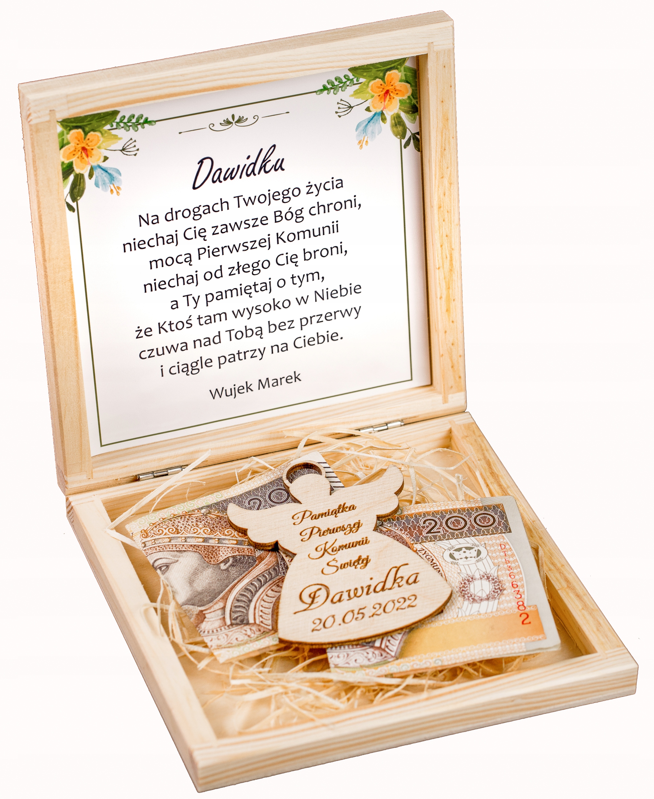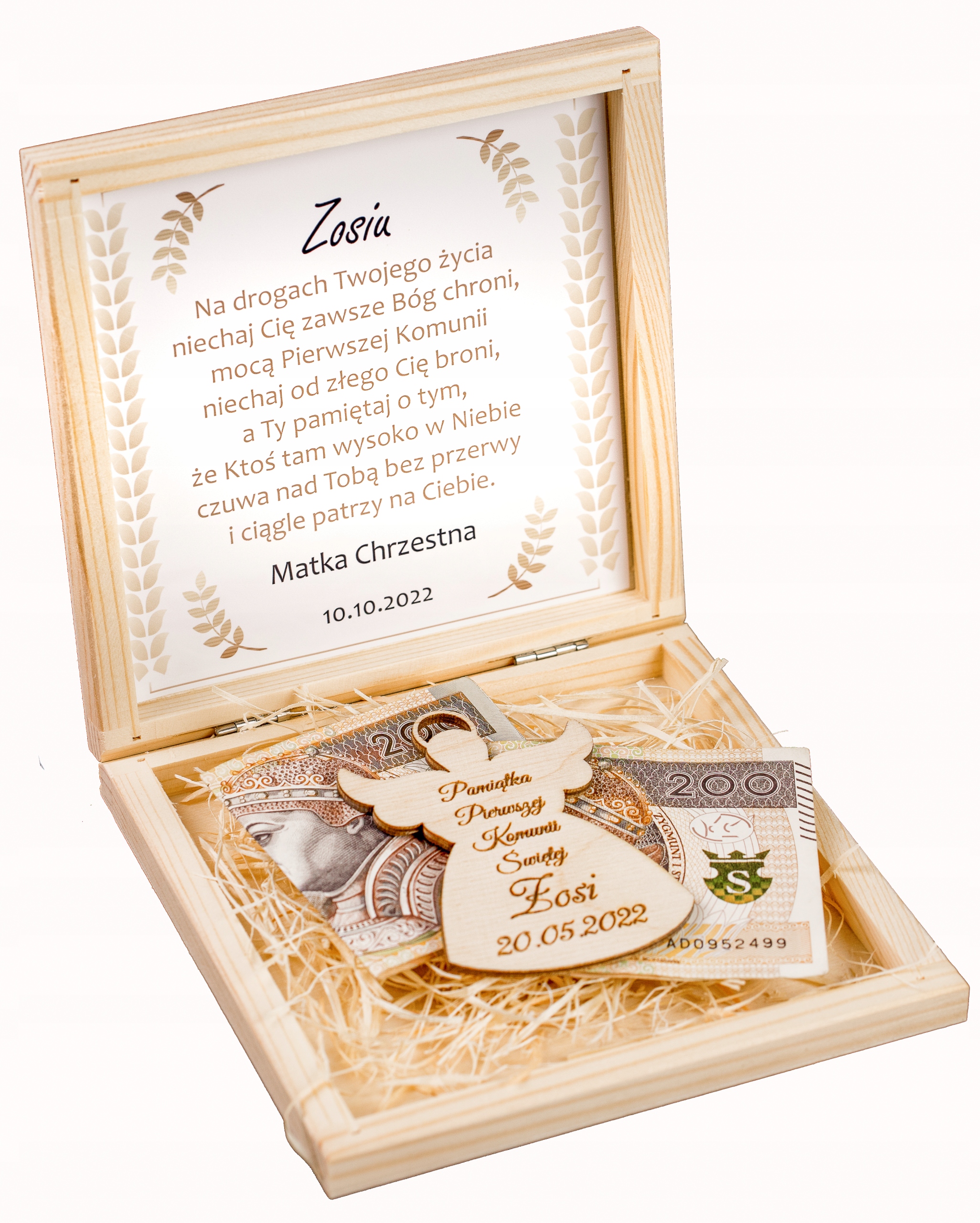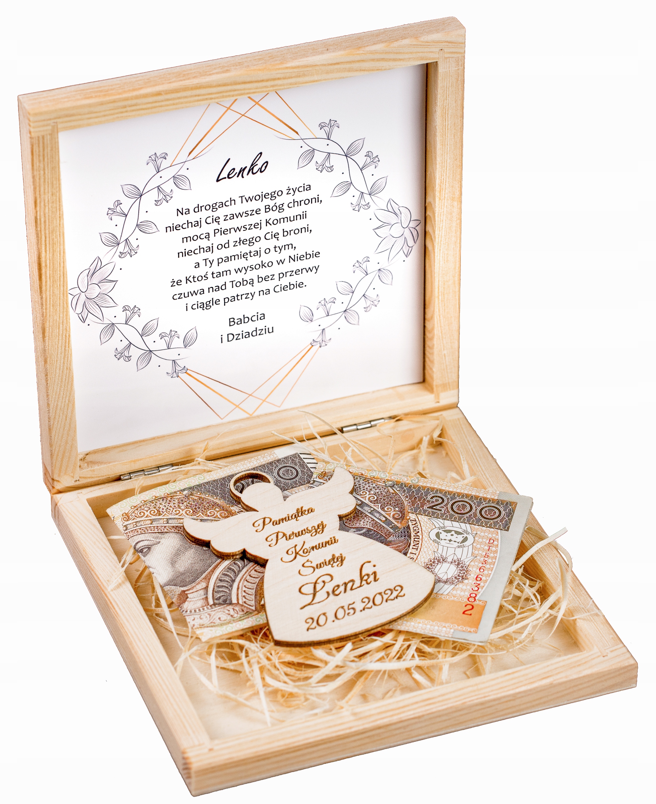 Закрытая, сосновая шкатулка с пожеланиями и персонализацией.