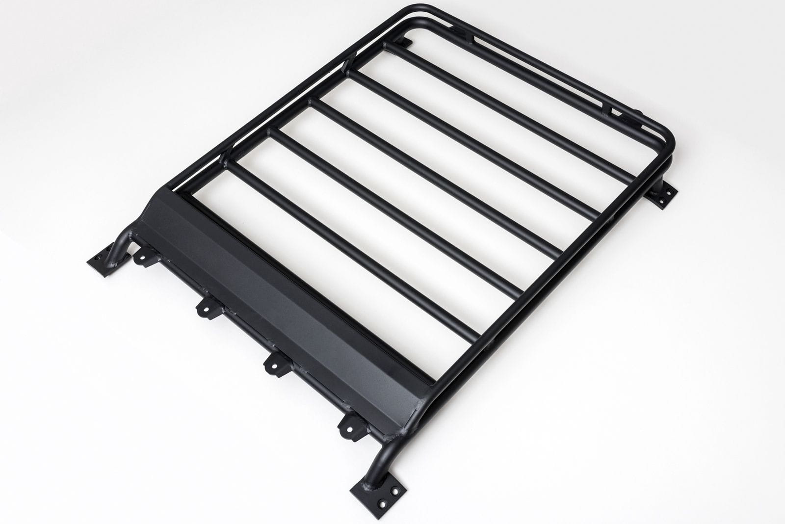 Сплошной багажник на крыше, разработанный специально для Suzuki Jimny 3-го поколения, устанавливается в монтажные отверстия заводских релингов. Багажник окрашен в черный цвет. Он оснащен обтекателем, минимизирующим сопротивление ветра, и кронштейнами, позволяющими установить дополнительное освещение на крыше.