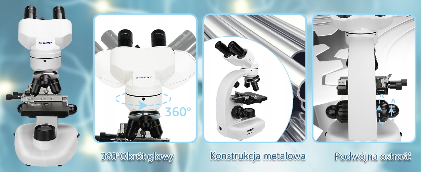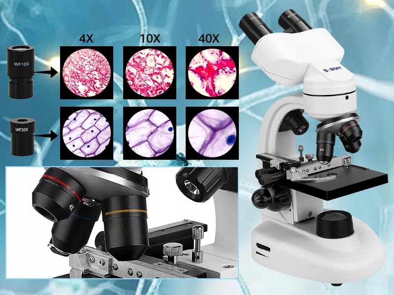 - увеличение 80x-1600x; Биологический микроскоп SV605 с 10 x 20 x очками и 2 x удлинителя; позволяет просматривать образцы в увеличении 80x; 160x; 200x; 400x; 800x и 1600x
