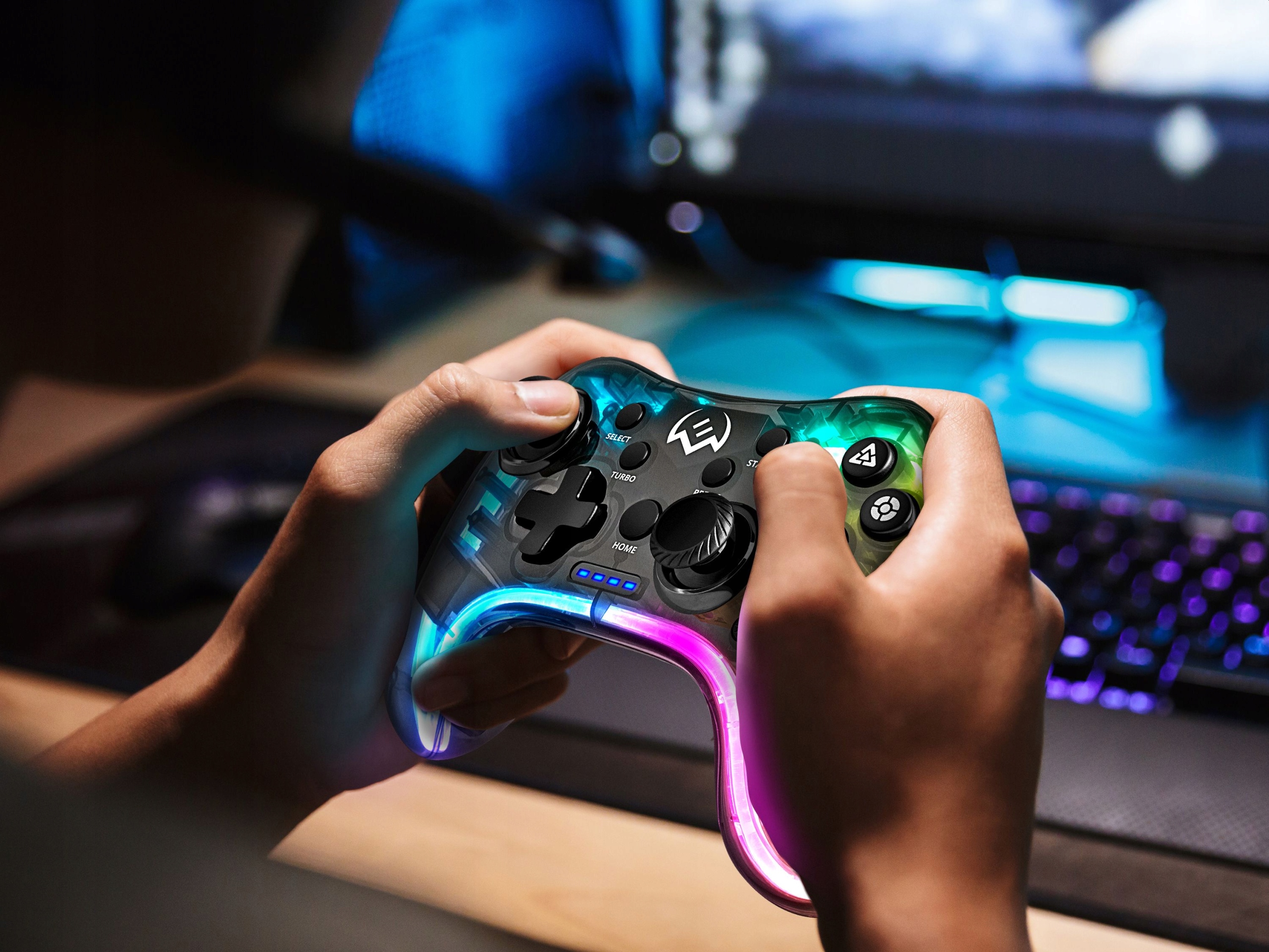 SVEN GC-5050 выделяется прозрачным корпусом, сквозь который можно увидеть все самые интересные детали внутреннего устройства геймпада – от кнопок до вибромотора. Динамическая RGB-подсветка подчеркивает уникальный дизайн устройства. Этот геймпад обязательно привлечет внимание и готов стать одним из ключевых элементов игрового пространства. Форма корпуса эргономична и гарантирует комфорт во время долгих часов виртуальных сражений.
