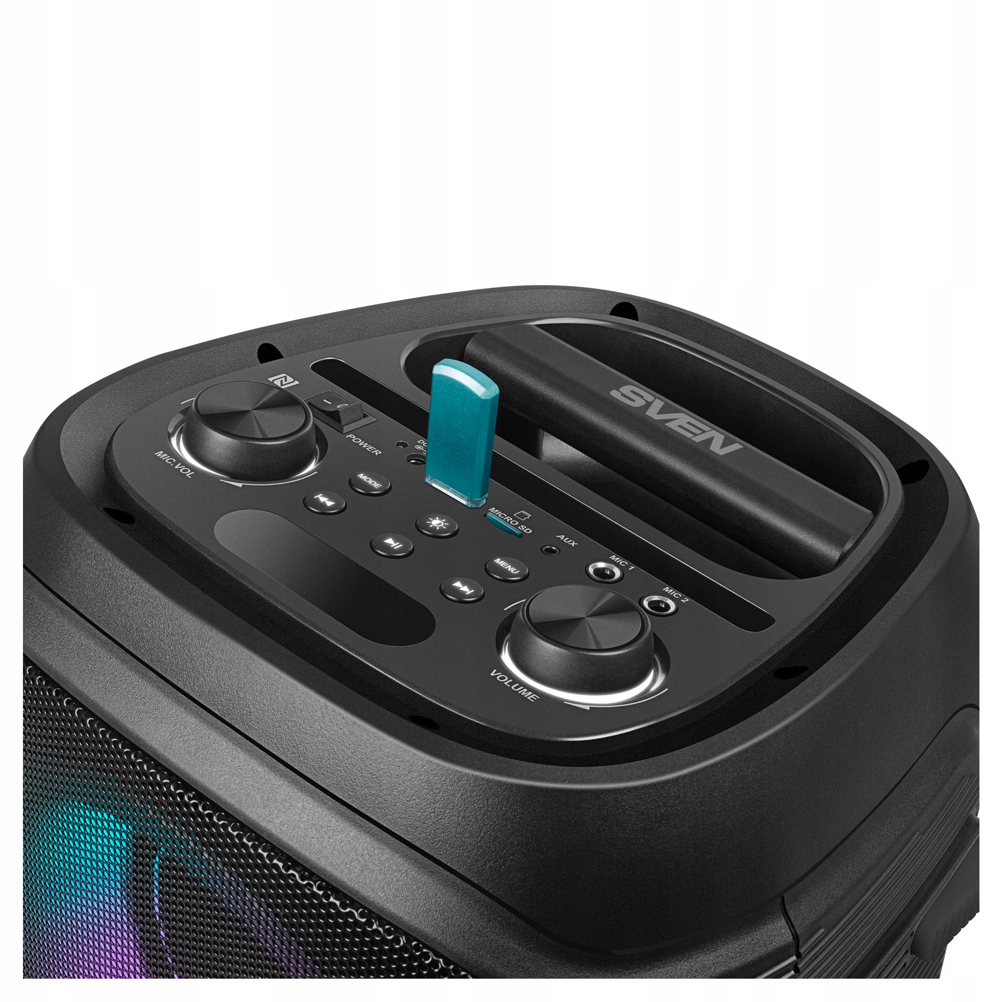 Колонка оснащена ярким светодиодным дисплеем и встроенным эквалайзером, а также беспроводным пультом… На первый взгляд видно, что SVEN PS-800 – это не карман. устройство, а надежная мобильная музыкальная система. Его размеры составляют 312х325х568 мм, а вес чуть больше 5 кг. Но переносить его с места на место сможет даже ребенок, а вы легко сможете взять его с собой на пикник или на дачу. Удобная ручка обеспечивает удобную транспортировку, а прочный пластиковый корпус выдержит постоянную и частую транспортировку.