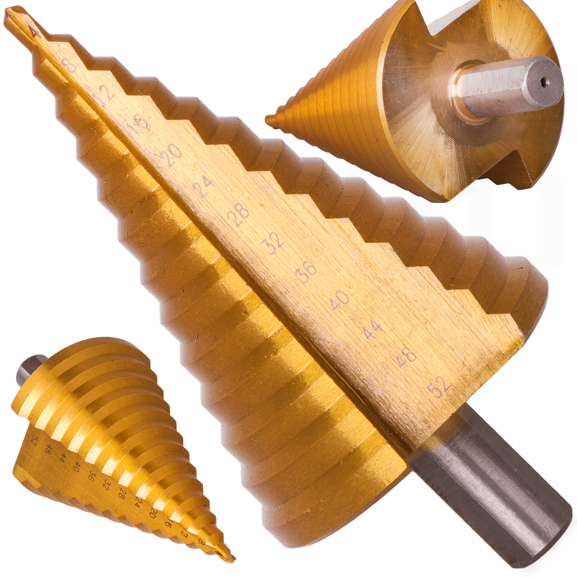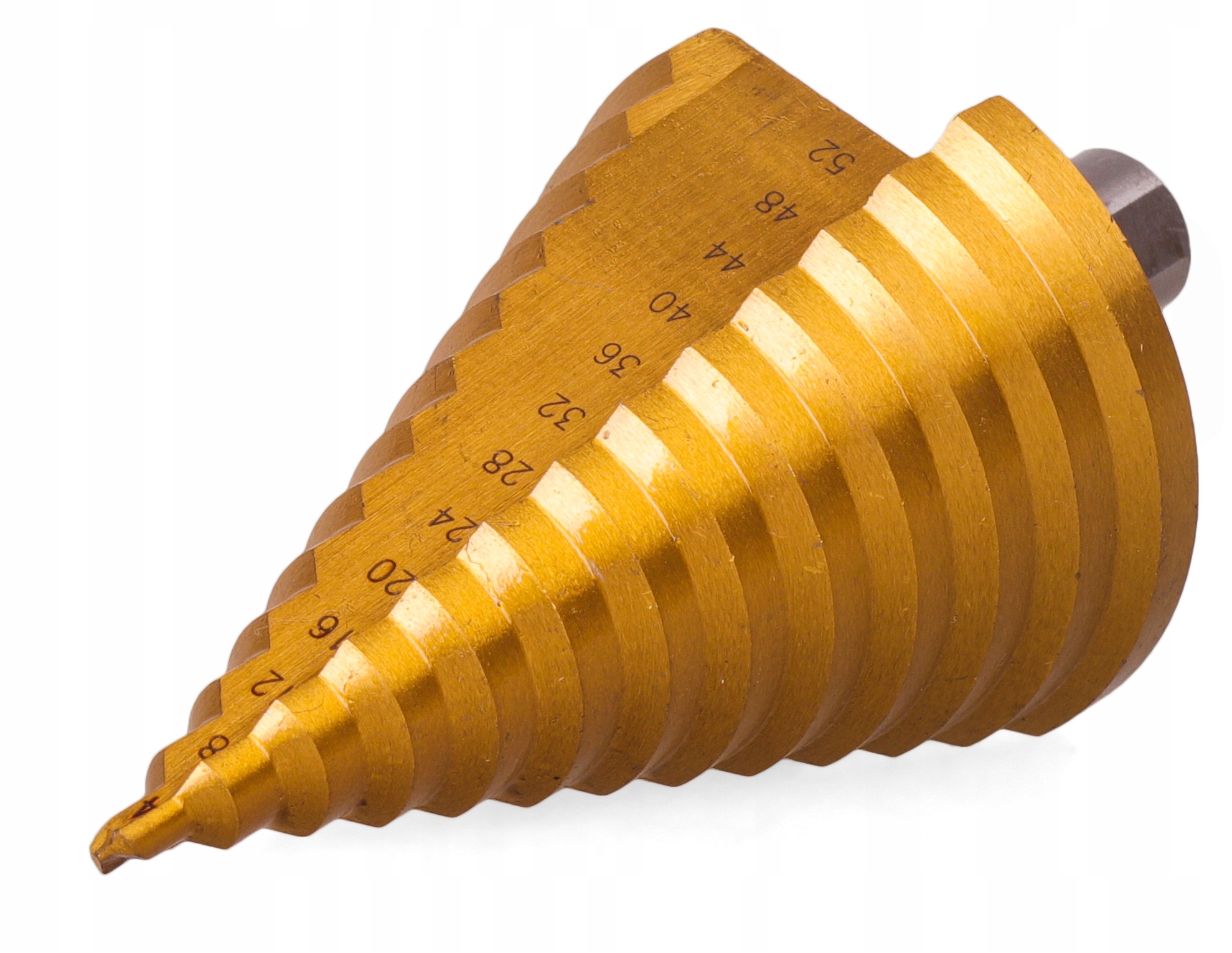 Ступенчатое сверло из быстрорежущей стали с титановым покрытием. Позволяет сверлить идеально круглые отверстия в стали, латуни, меди, алюминии, дереве и пластике.