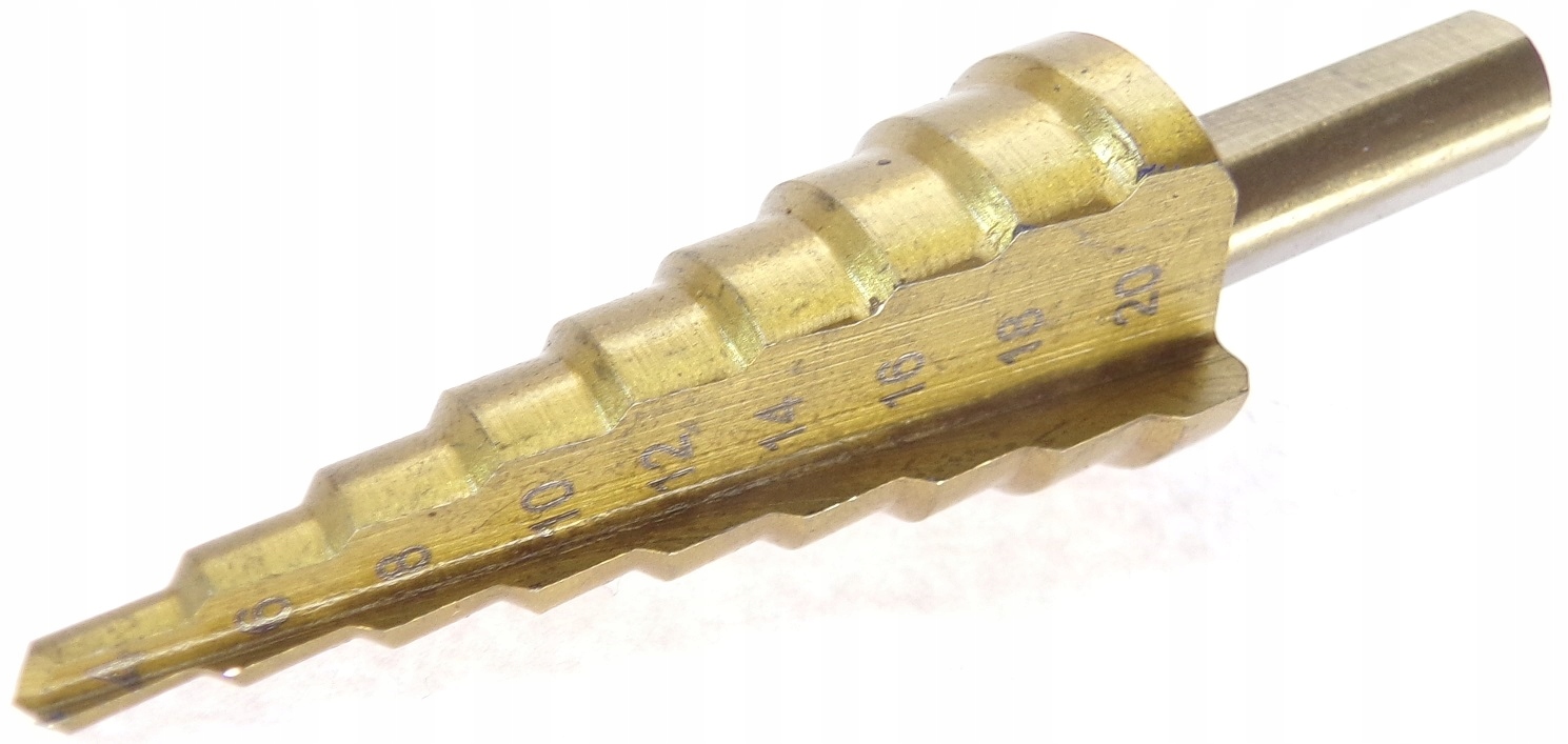 Ступенчатое сверло из быстрорежущей стали с покрытием из титана. Позволяет сверлить идеально круглые отверстия в стали, латуни, меди, алюминии, дереве и пластике.