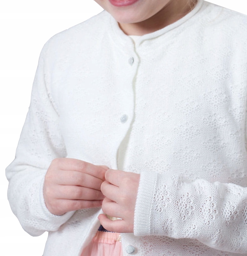 Белый свитер для девочек на молнии с декоративными серебряными пуговицами. Круглый вырез горловины, ажурный узор, классический крой.