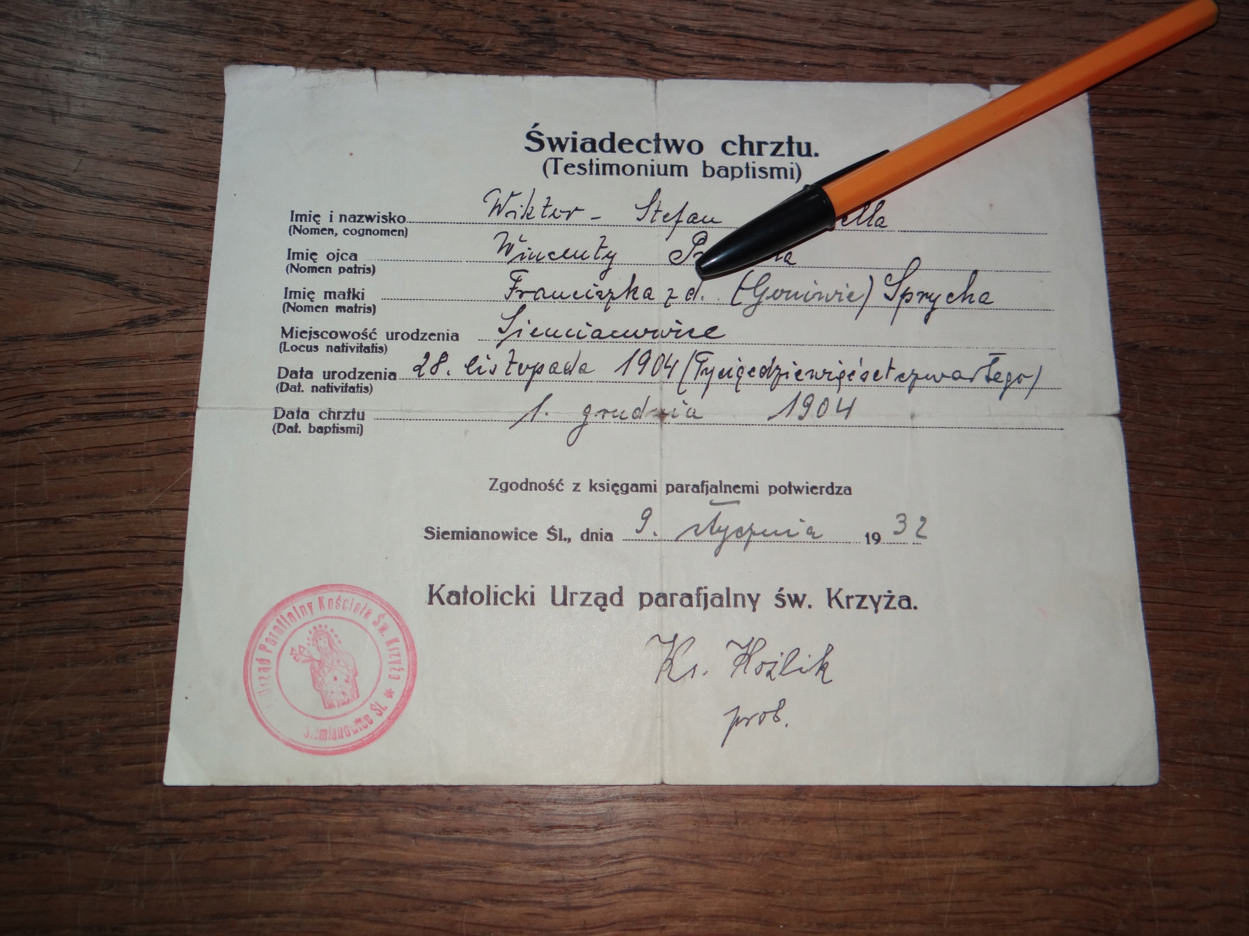 СВИДЕТЕЛЬСТВО О КРЕЩЕНИИ СЕМЕНОВИЦЕ-СЛЕНСКОЕ 1932 г.