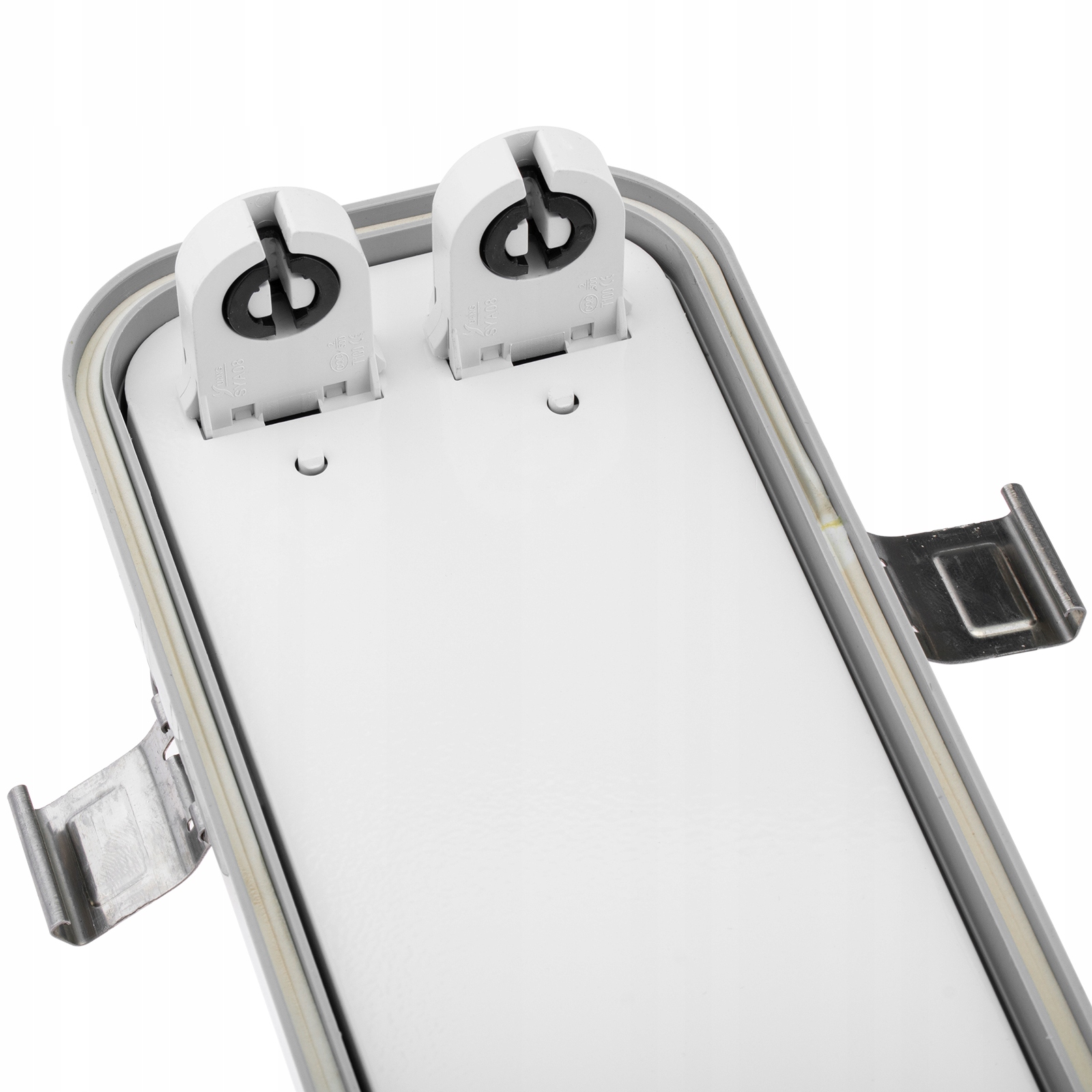 Герметичный светильник оснащен внутренним металлическим основанием, благодаря которому тепло, излучаемое люминесцентными лампами, идеально распределяется по всему светильнику, что предотвращает локальные перегревания и перенапряжения. .