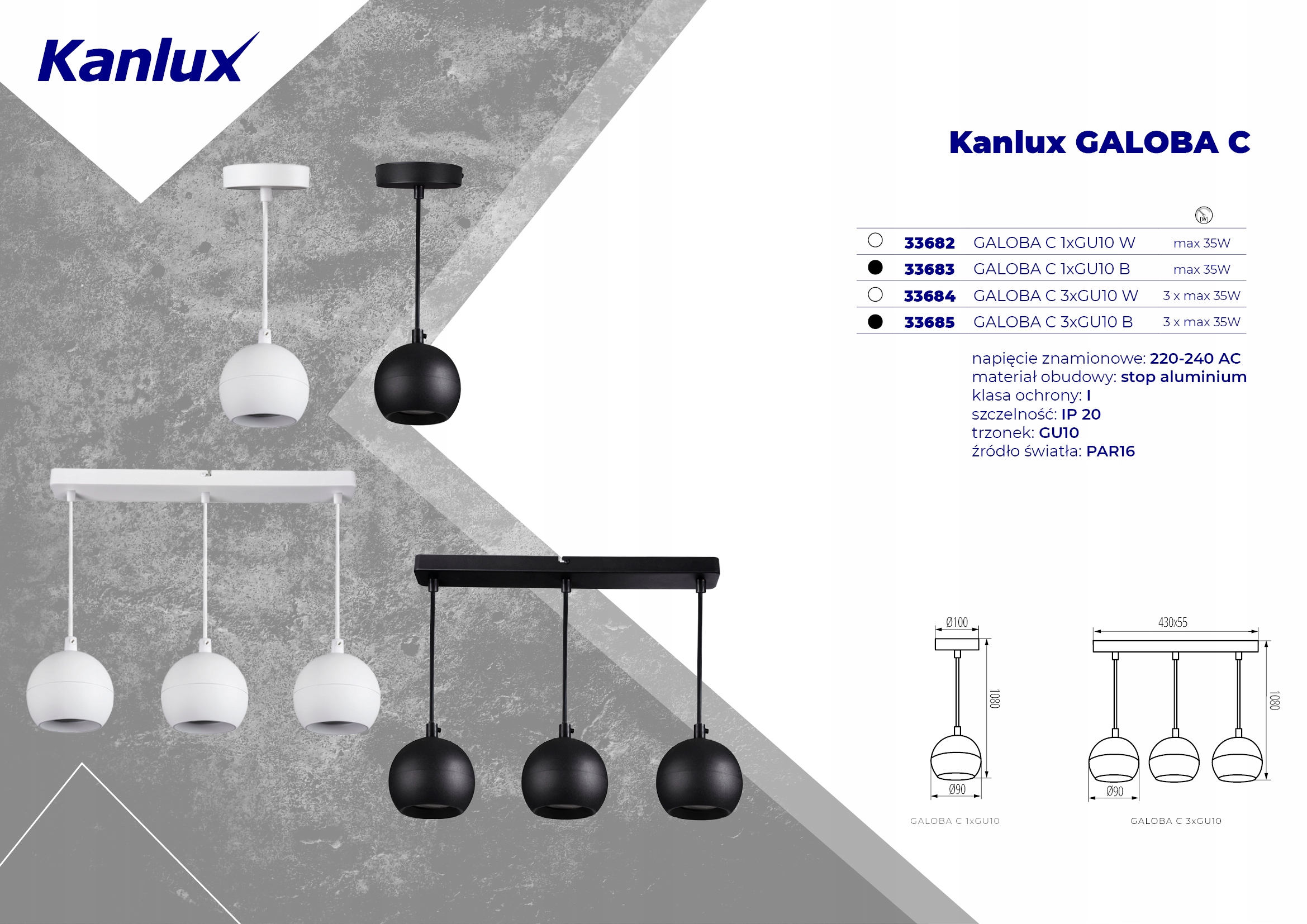 Kanlux GALOBA — это полная серия осветительных приборов, в которую входят подвесные светильники (GALOBA C), настенные светильники (GALOBA W), а также настенные и потолочные светильники. Подвесные светильники Kanlux GALOBA C с успехом можно использовать для освещения островов или столов, настенные и потолочные светильники (от 1 до 4 световых точек) можно использовать в гостиной, холле или спальне. Композицию дополнят настенные светильники с выключателем в основании. Вся серия светильников Kanlux GALOBA имеет съемный абажур, благодаря которому можно быстро и удобно заменять источники света.