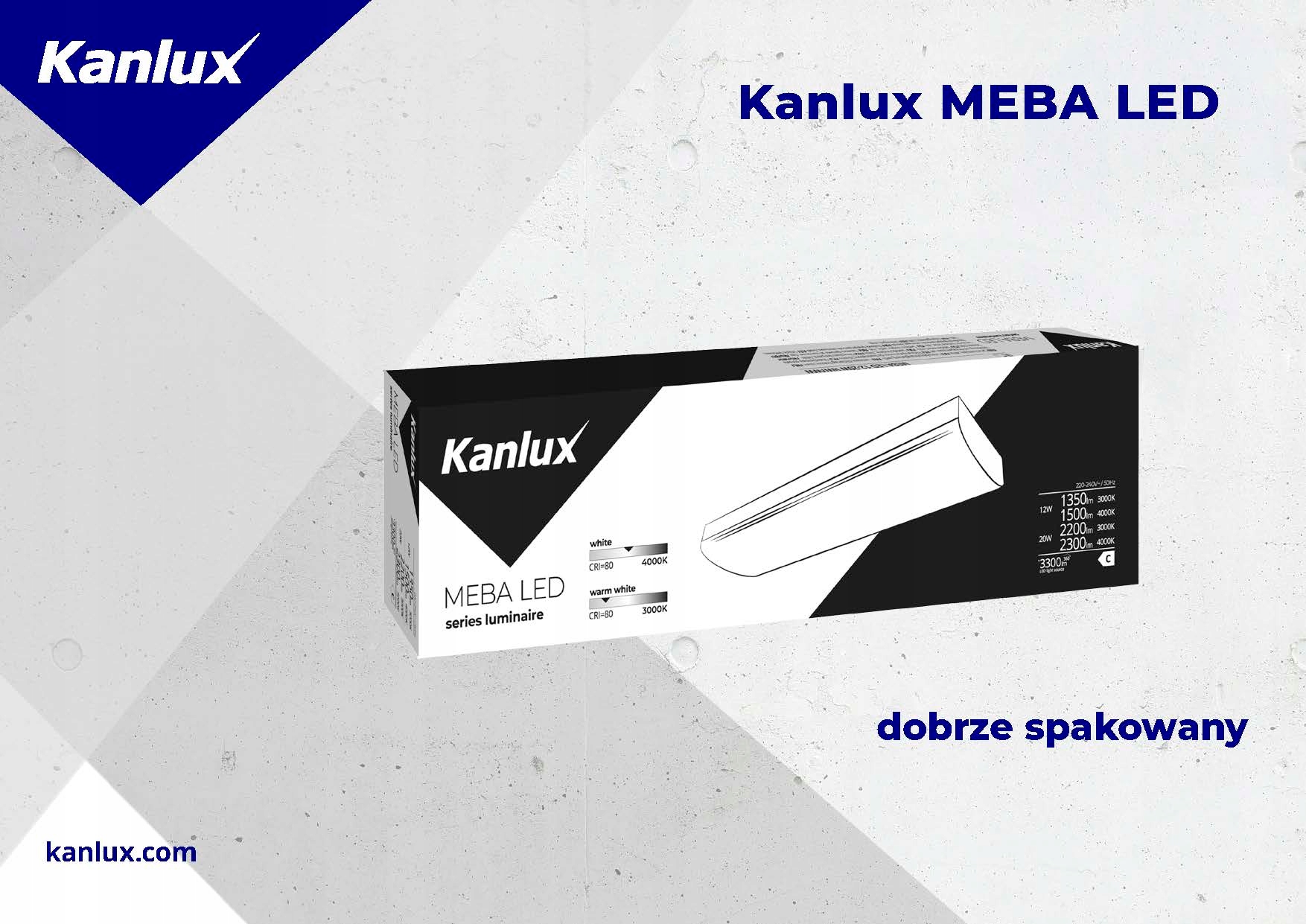 Kanlux MEBA LED — серия накладных светильников, дополняющая популярное семейство светильников Kanlux MEBA. На выбор доступны модели длиной 600мм (12/20Вт) и 1200мм (22/40Вт), каждая из них имеет две мощности и два цвета света (3000/4000К) в одном корпусе. Kanlux MEBA LED – это высокая светоотдача (до 125лм/Вт), долговечность 50 000 часов и гарантия 5 лет. Дополнительным преимуществом этих светильников является прочный рифленый абажур из ПК.