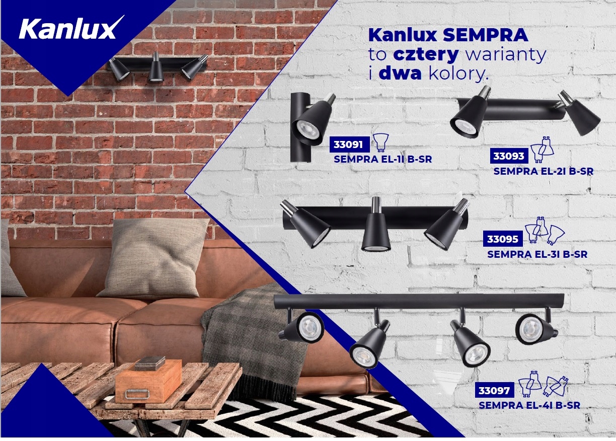 Kanlux SEMPRA – это серия элегантных спотов в бело-серебристом и черно-серебристом цвете. Благодаря оригинальной планке, на которой крепятся абажуры, все модели можно использовать как на потолке, так и на стене – это дает нам новые возможности для организации освещения помещения. Очень интересное решение — возможность вертикального крепления на стене даже светильника с 4 источниками света.