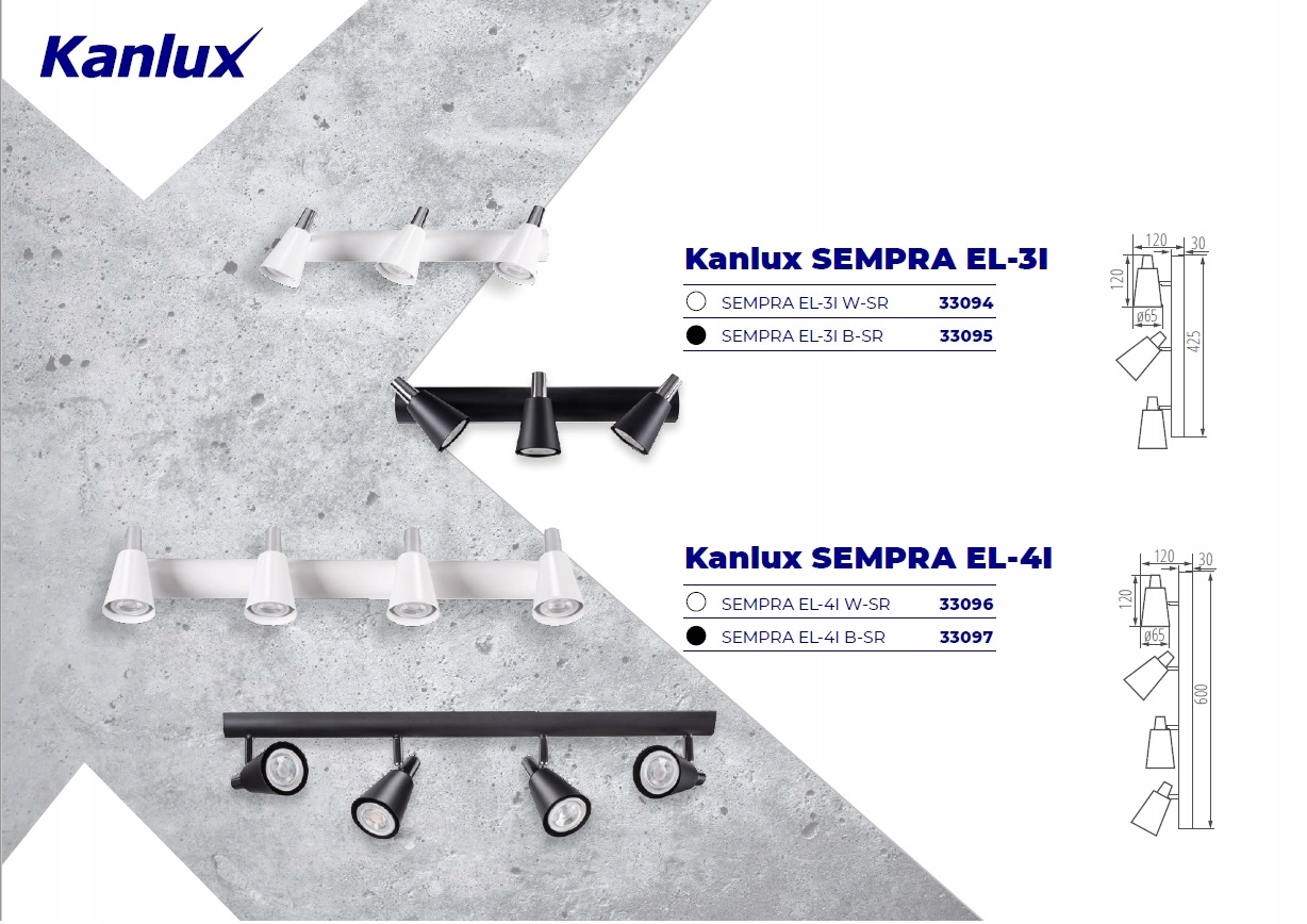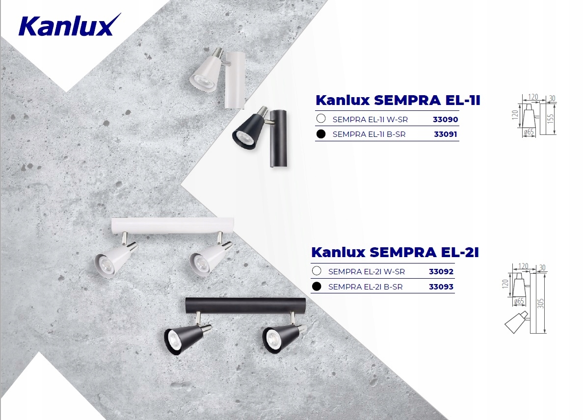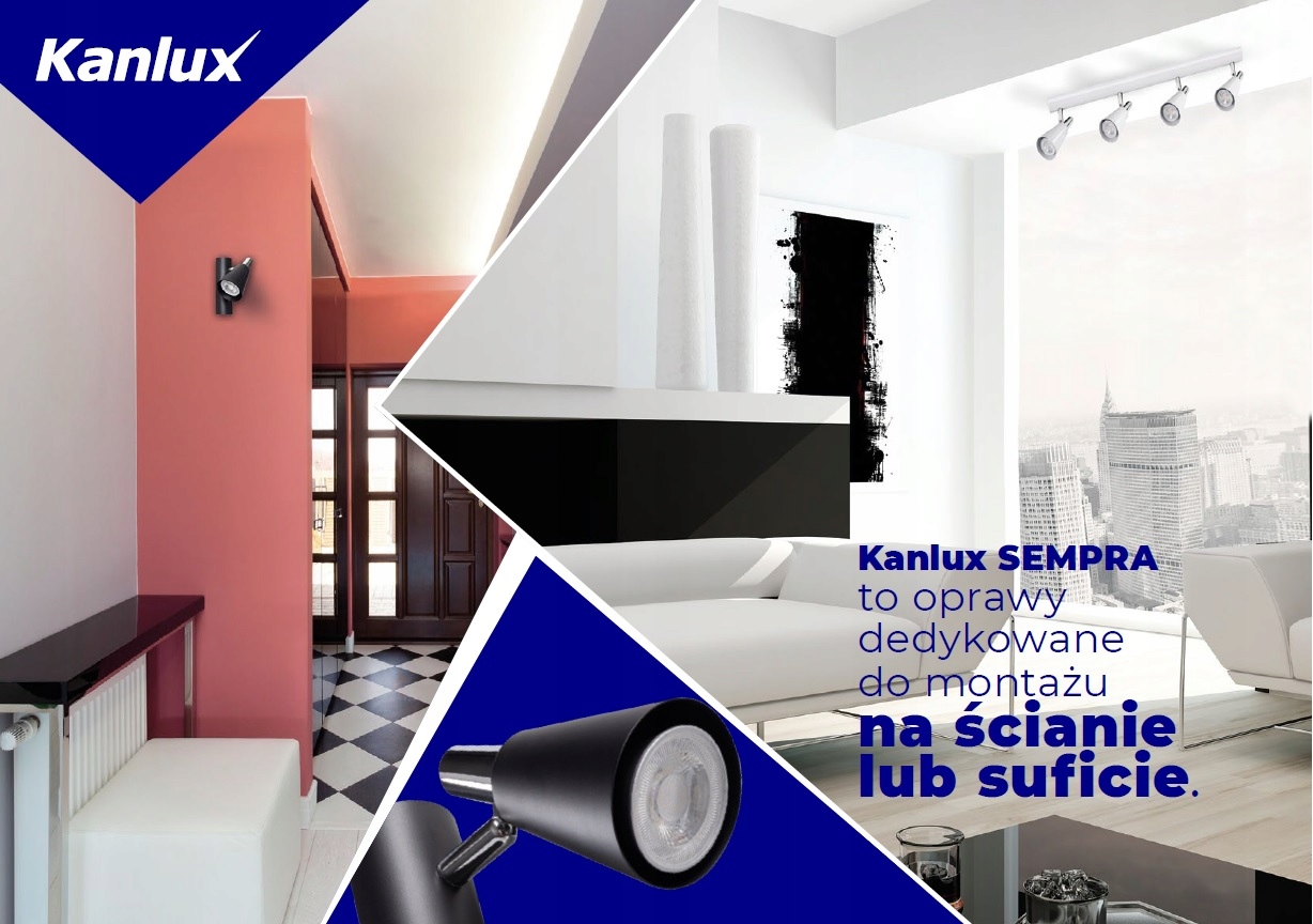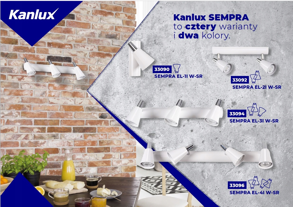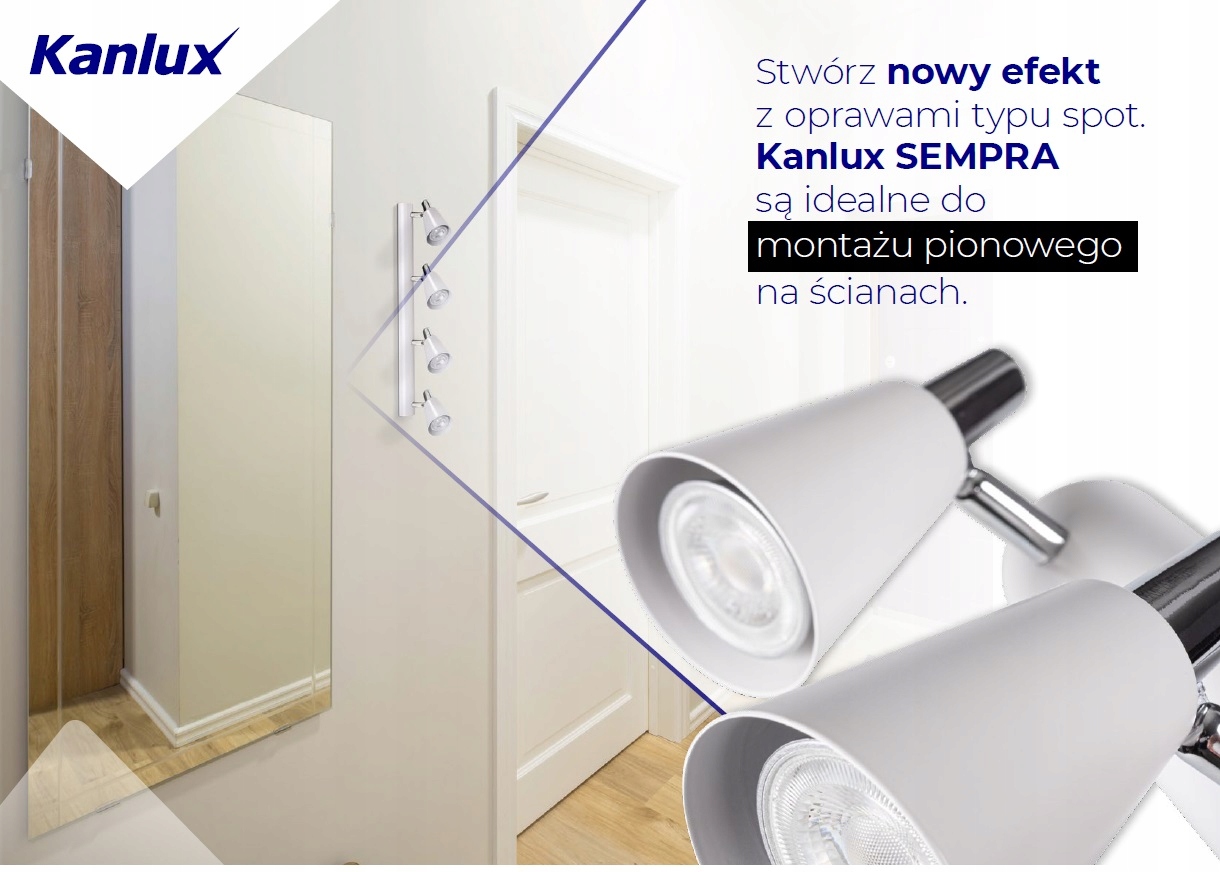 Kanlux SEMPRA – это серия элегантных спотов в бело-серебристом и черно-серебристом цвете. Благодаря оригинальной планке, на которой крепятся абажуры, все модели можно использовать как на потолке, так и на стене – это дает нам новые возможности для организации освещения помещения. Очень интересное решение — возможность вертикального крепления на стене даже светильника с 4 источниками света.