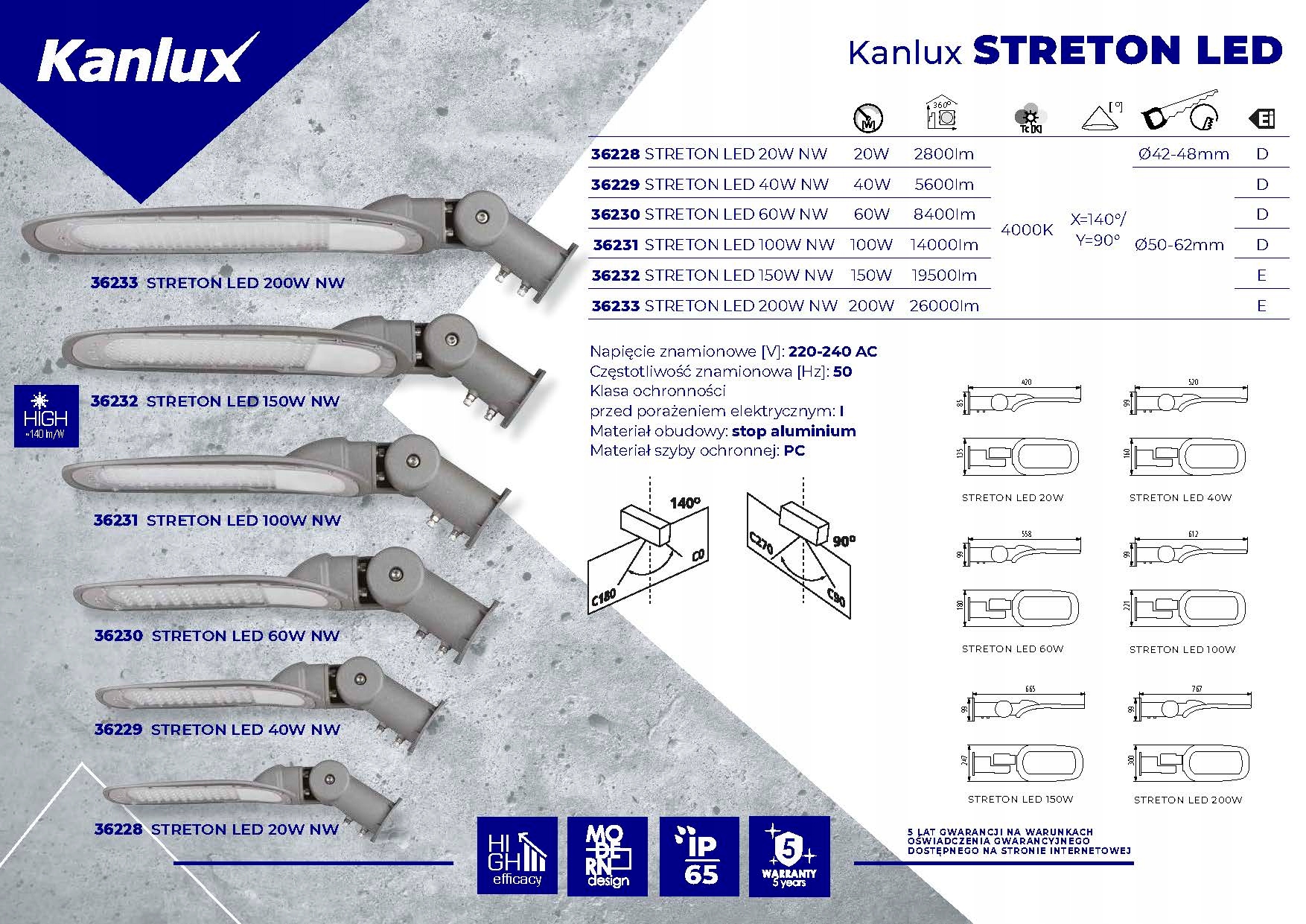 Kanlux STRETON LED — уличные светильники, предназначенные для освещения парковок или больших площадей, которые должны быть хорошо освещены даже в темное время суток. Их долговечность (50 000 часов), герметичность (IP65) и высокая мощность (до 200 Вт) делают Kanlux STRETON LED идеальным дополнением инвестиций в городское пространство, парковки, спортивные сооружения или скверы.