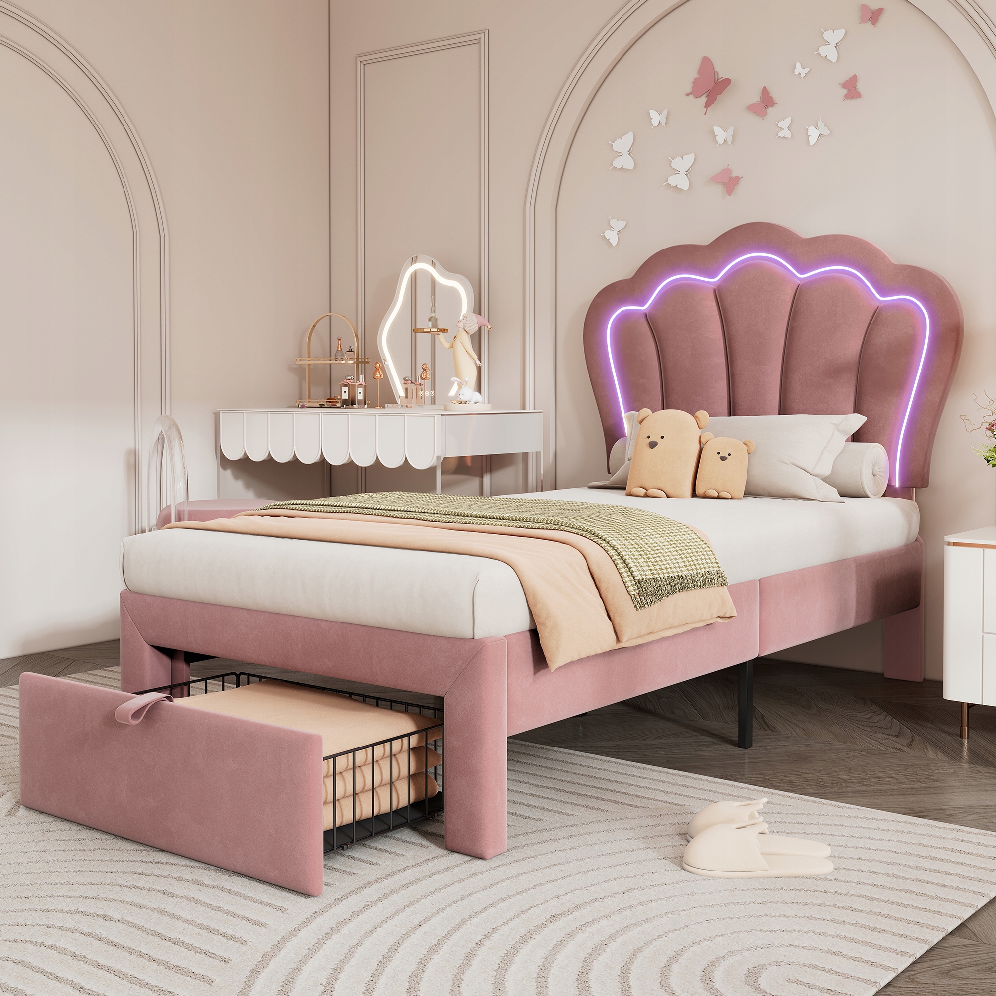 Светодиодная детская кровать 90x190 см, обитая, ящики, приложение, розовый