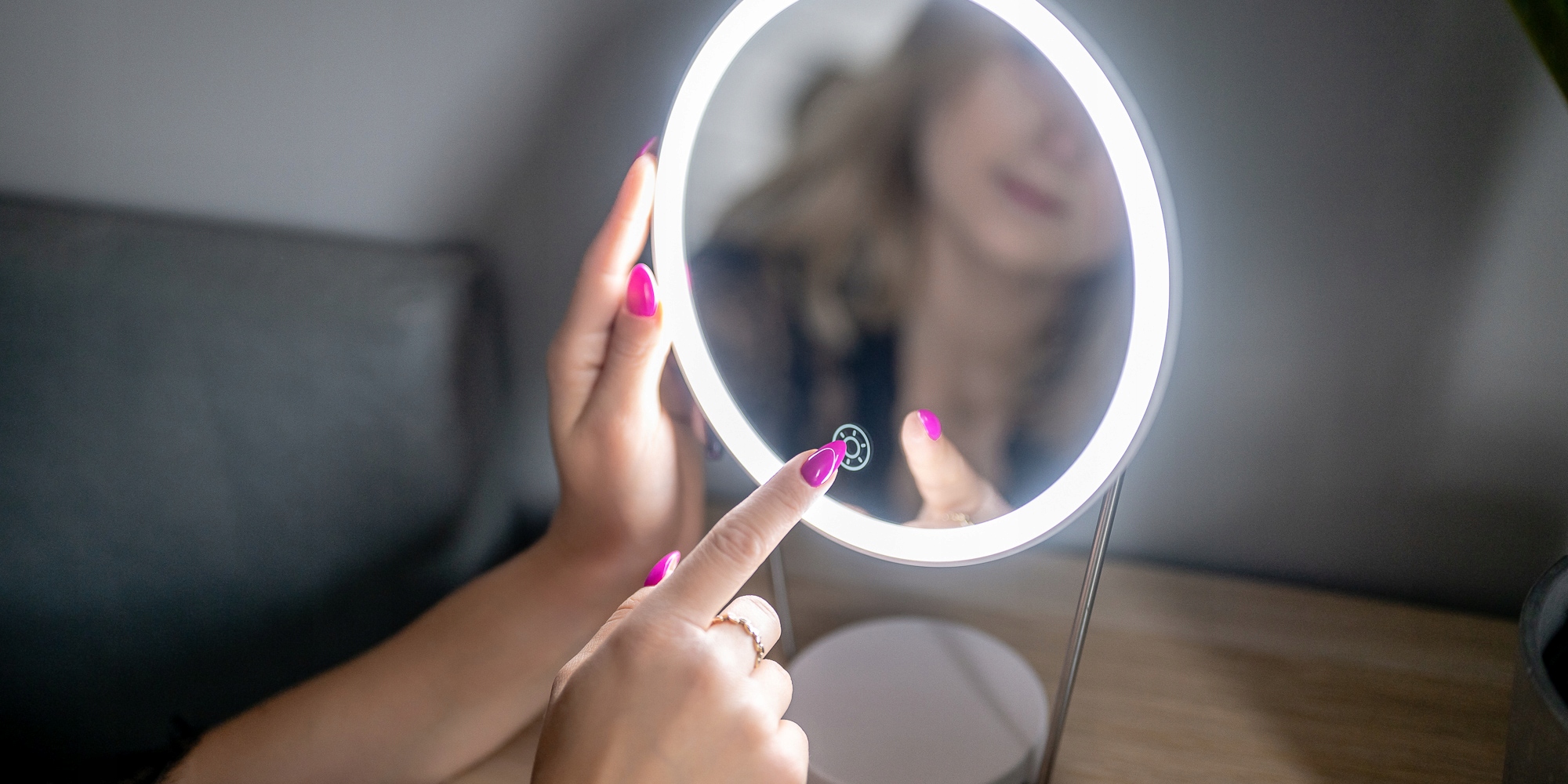 В зависимости от времени суток и существующих условий освещения вы можете самостоятельно регулировать мощность светодиодов, закрытых под молочным рассеивателем. Просто используйте сенсорную кнопку, встроенную в поверхность зеркала. Высокая интенсивность света хорошо работает в солнечный день, а более низкая интенсивность света — идеальное решение для макияжа, сделанного после наступления темноты или в темной комнате. Хорошо сбалансированный свет не режет глаза, что обязательно облегчит вам работу над макияжем.