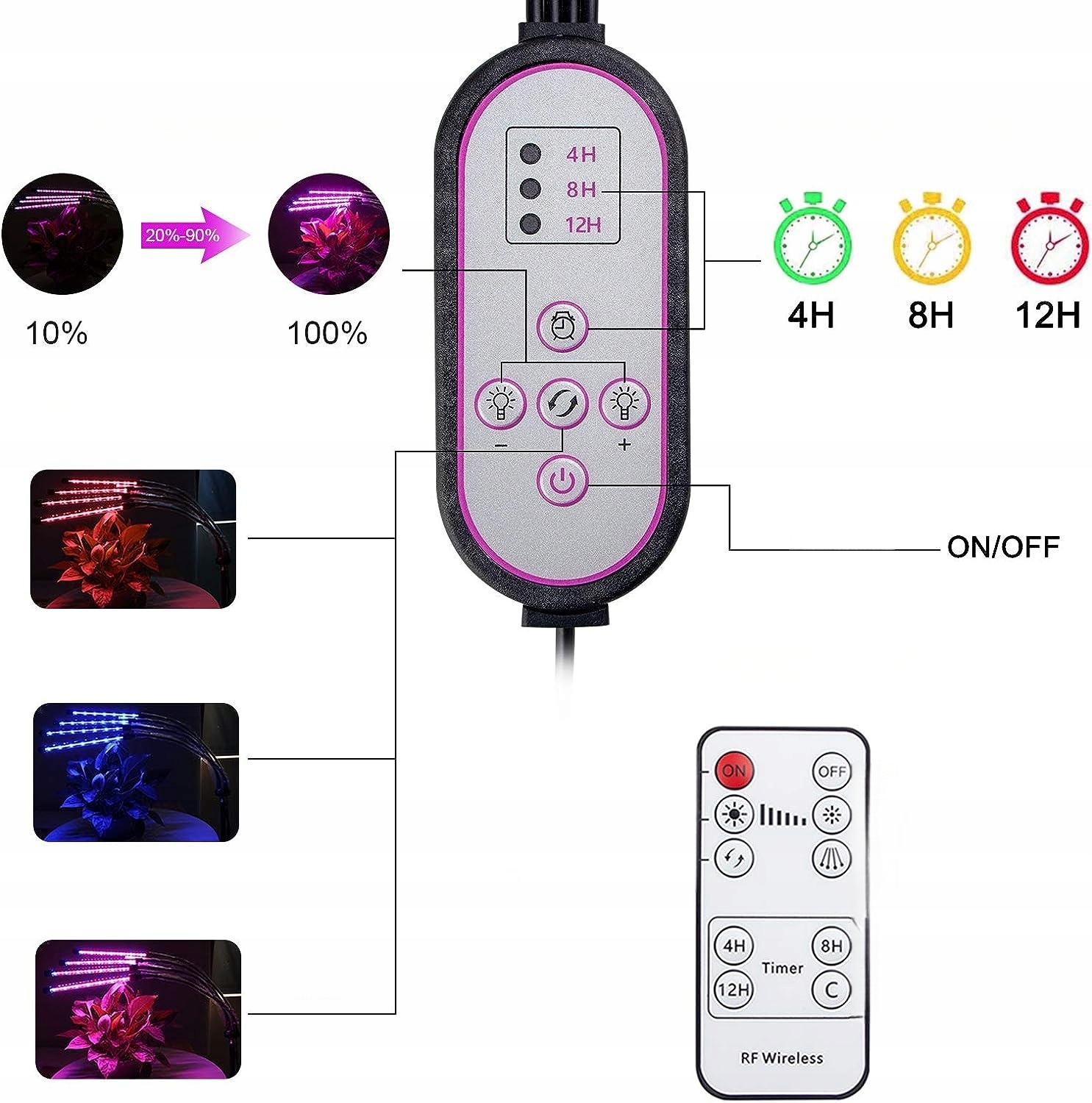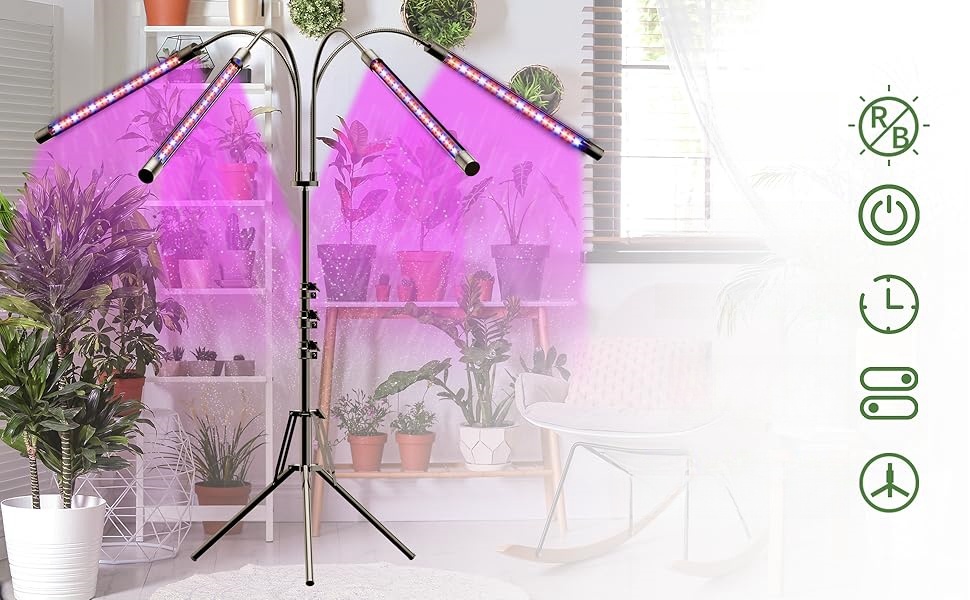 Этот светильник для выращивания растений оснащен контроллером линейного входа и радиочастотным контроллером (в пределах 30 метров). Вы можете установить автоматическое освещение на 4 часа/8 часов/12 часов, автоматическое включение/выключение, больше не нужно вручную регулировать настройки каждый день. Каждой светодиодной головкой можно индивидуально управлять включением/выключением.