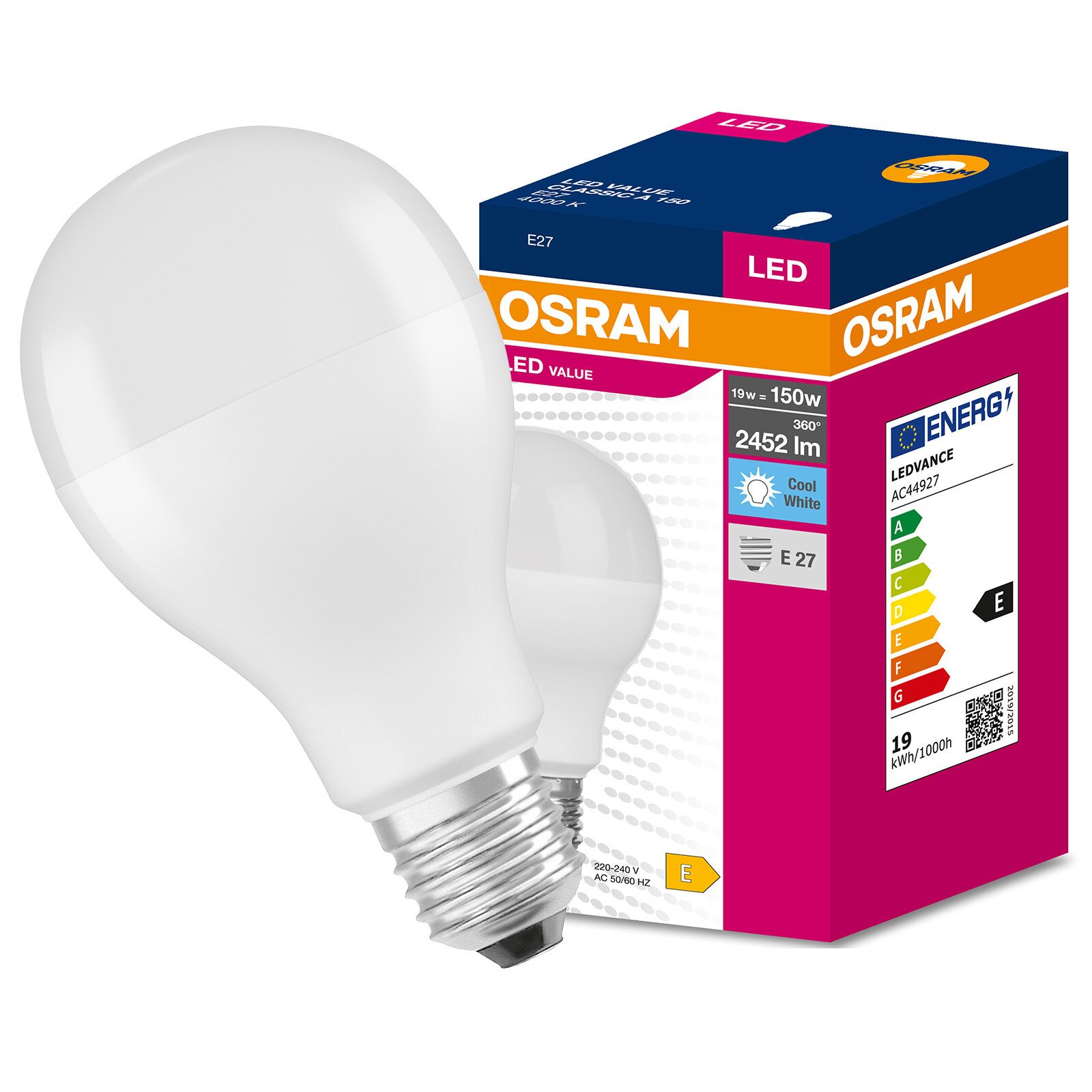 Светодиодная лампа серии VALUE от авторитетной и признанной в светотехнической отрасли компании OSRAM с цоколем E27, углом света 200° и мощностью 19 Вт (эквивалент классической лампе 150 Вт) представляет собой высококачественный источник света с нейтральным цветом 4000K и потоком света. 2452лм.