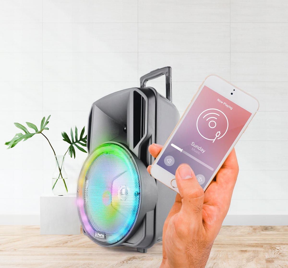 максимальной мощностью 1400 Вт, имеющая встроенный аккумулятор, поэтому доступ к электрической розетке не требуется. Он оснащен светодиодными световыми эффектами, которые порадуют глаз каждого. Благодаря беспроводному микрофону он идеально подходит для выступлений и караоке. Устройство имеет Bluetooth, благодаря которому вы можете воспроизводить любимую музыку, а к разъему jack на задней панели колонки подключить гитару или другой инструмент.