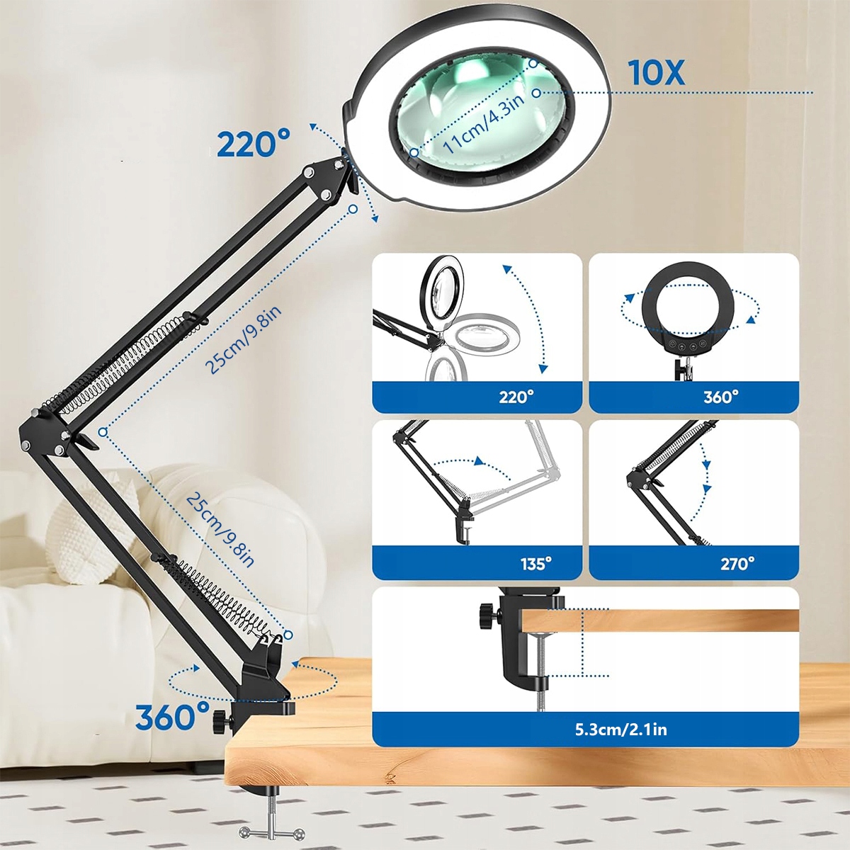 ✨✨✨10-кратная лупа с подсветкой, 5 цветовых режимов, плавная регулировка яркости, 2 в 1, настольная лампа и зажим, лупа со светодиодной подсветкой, подсветкой и подставкой, свободные руки для самостоятельной работы, рисования и работы крупным планом (черный)✨✨✨