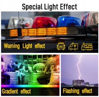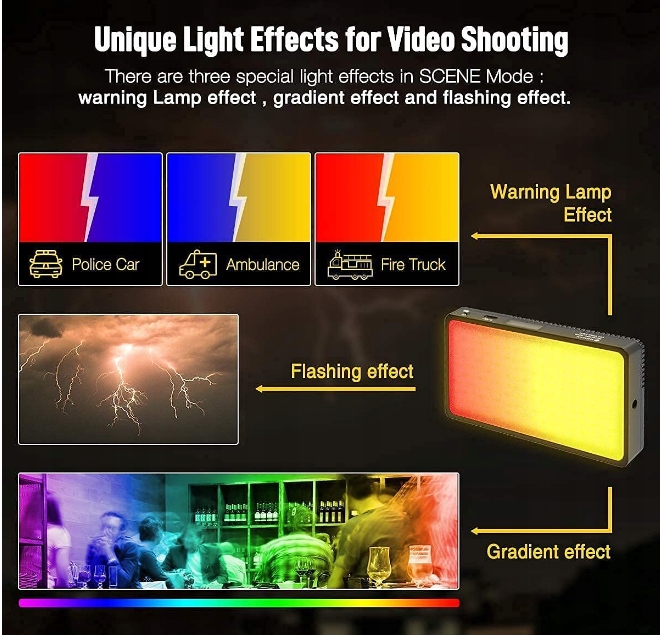 Независимо от того, световой эффект специальных транспортных средств (например, полицейская машина, пожарный багажник и машина скорой помощи), эффект градиентного света или эффект мигающего света, все они доступны в этом видеосвете, отвечающем вашимспециальным съемкам