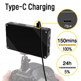 Благодаря встроенной литиевой батареей емкостью 3200 мАч видеолампа работает 2 4 часа при яркости 5 %, 150 минут при яркости 100 % и может заряжаться. через USB-кабель.