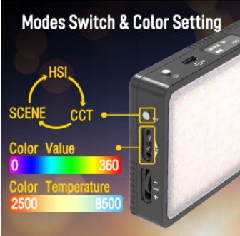 С помощью внешней кнопки переключателя режима фотографы могут быстро переключаться между тремя режимами освещения ( CCT/HSI/SCENE ), а затем настраивать соответствующие параметры, такие как задавайте цвет (0–360°) и цветовую температуру (от 2500 К до 8 500 К) в каждом режиме с помощью Многофункциональной кнопки во время съемки.