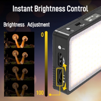 Мгновенная регулировка яркости: 0–100 %. Регулировка яркости с помощью ручки. Вы можете быстро изменить яркость этого видеолампы в соответствии с вашими требованиями к записи. Нажмите кнопку питания, чтобы в любой момент проверить текущую яркость.