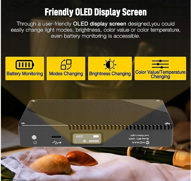 Подсветка видеокамеры Moman MLX-RGB с регулируемой яркостью, 2500–8500K, CRI 96+, светодиодная панель камеры с силиконовым рассеивателем, OLED-дисплеем, поддержка трех режимов освещения, зарядка цифровой зеркальной камеры типа C