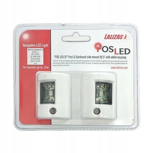 Комплект светодиодных навигационных фонарей 112,5 градусов. (сторона: зеленая и красная) для агрегатов длиной до 12 м. Водонепроницаемые корпуса изготовлены из белого материала, устойчивого к ультрафиолетовому излучению. Срок службы светодиодов - до 50 000 часов.