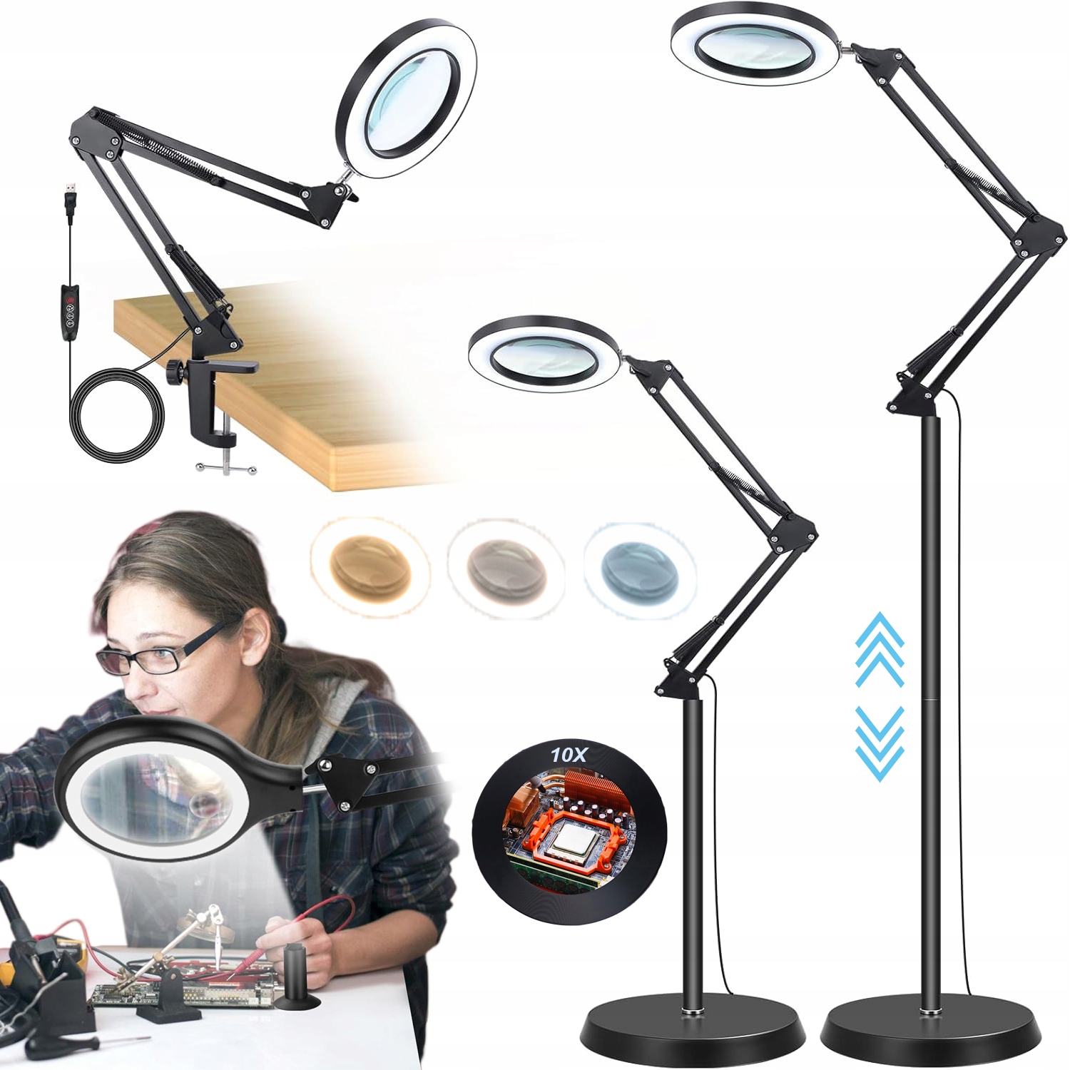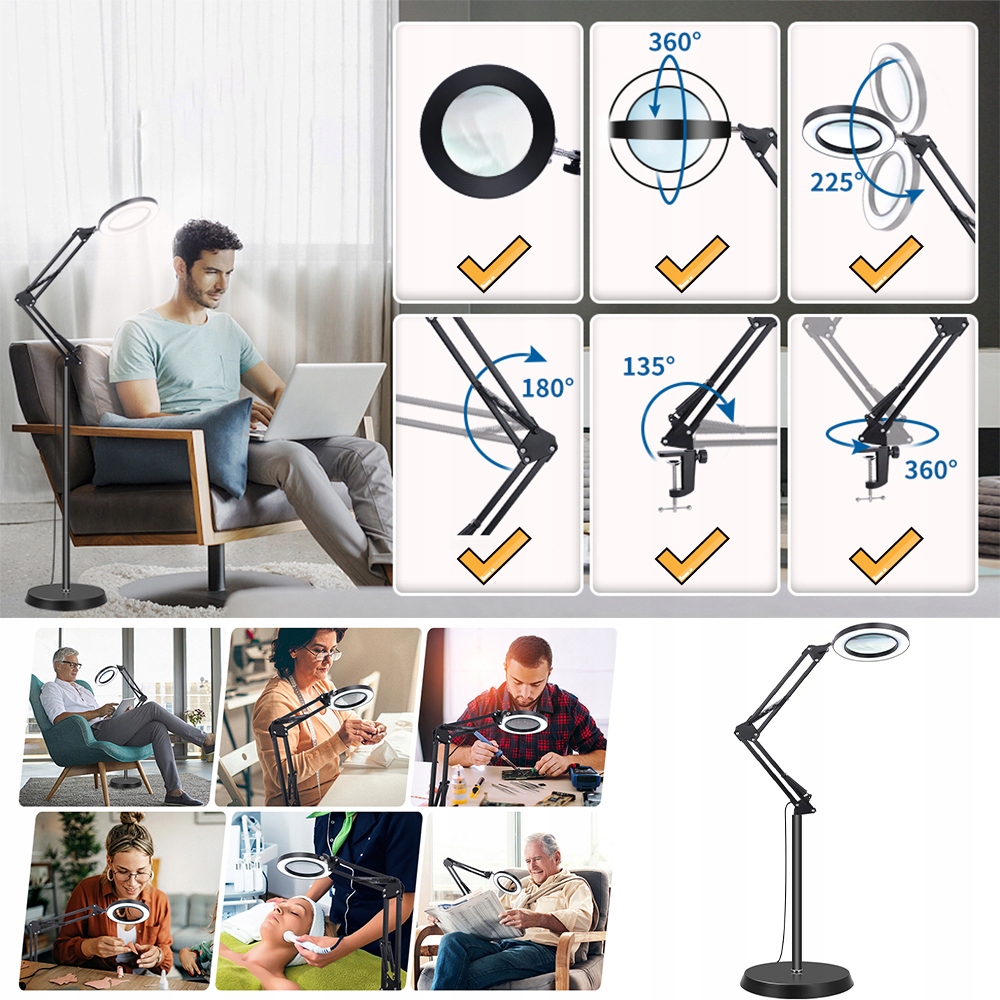 МНОГОФУНКЦИОНАЛЬНАЯ НАСТОЛЬНАЯ ЛАМПА, СВЕТОДИОДНЫЙ ТОРШЕР С 10-кратным УВЕЛИЧЕНИЕМ, 3 ЦВЕТОВЫХ РЕЖИМА, РАСШИРЯЕМЫЕ