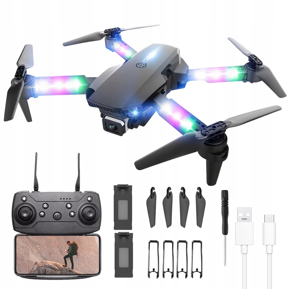 - Функции: прозрачные цветные светодиодные ручки, переключение двойной камеры, фиксированная высота, взлет одной кнопкой, приземление одной кнопкой, подъем и спуск, полет вперед и назад, полет влево и вправо, управление, безголовый режим, запись фото и видео с помощью жестов, траектория полета, определение гравитации, автоматический захват фотографий и многое другое.