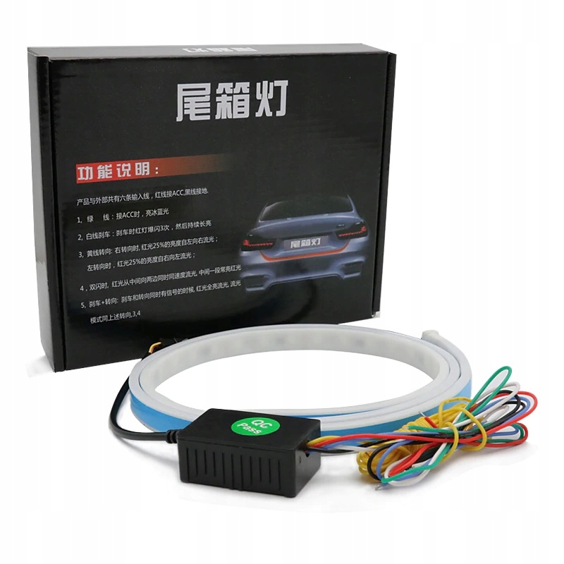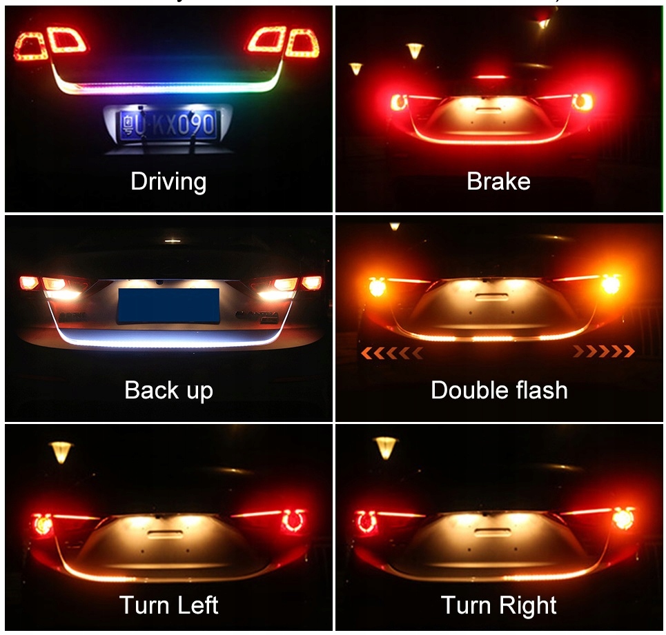 Гибкая светодиодная лента является решением новейших технологий и предназначена для людей, желающих добиться неповторимого внешнего вида своего автомобиля. Полоса имеет уникальную функцию плавного поворотника, как и в последних моделях автомобилей. Последовательная работа означает, что когда мы включаем указатель поворота во время нормальной работы в качестве освещения багажника, подсветка RGB временно выключается и снова включается, когда мы выключаем указатель поворота. Аварийные огни излучают свет от центра полосы наружу в двух направлениях. Фантастический эффект, простая установка. Кроме того, имеется стоп-сигнал, который при включении сначала мигает 3 раза, а затем включается постоянно. Последний свет — фонарь заднего хода — вся полоса светится равномерно белым. Цвет RGB, отвечающий за позиционную подсветку, работает попеременно, отображая несколько разных режимов освещения (струящееся, мигающее и т. д.).