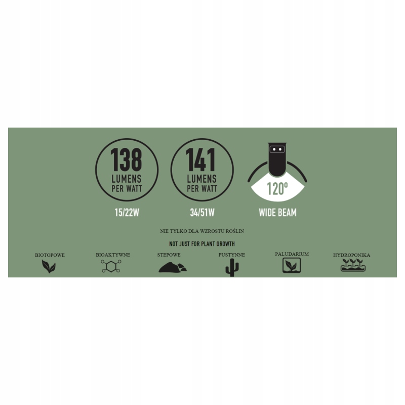 - Высокие параметры PAR (см. таблицу высоты подвеса и мощности), PUR 62% (полезный свет для фотосинтеза), CRI 85 (цветопередача)