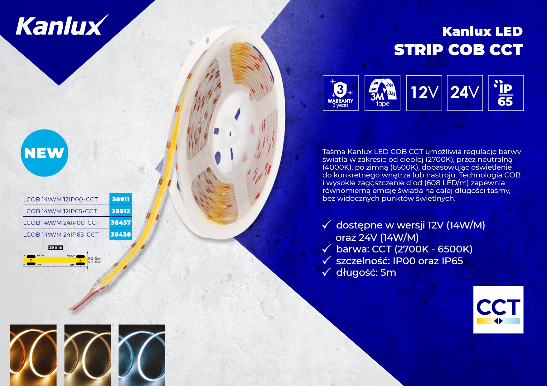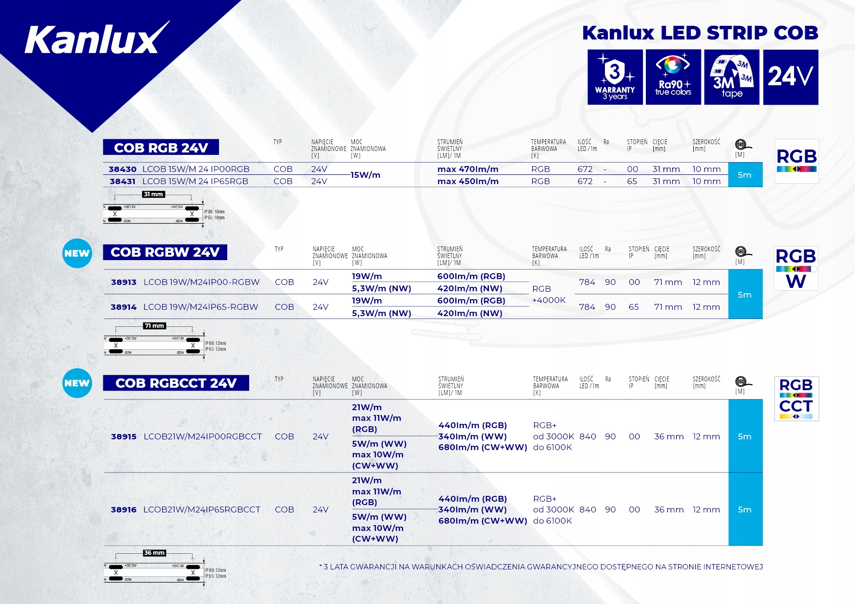 Светодиод Kanlux LCOB 3W/M 24V источник светодиодного источника-источник энергии, который позволяет вам создавать более длинные секции установки без страха. Используемая технология COB гарантирует равномерную легкую линию, идеально подходящую для декоративного и полезного применения. Вы можете выбрать из трех цветов освещения - тепла (3000 тыс.), Нейтральный (4000K) и холодный (6500 тысяч), благодаря каким лентам отлично подходит как для жилых, так и для коммерческих помещений. Доступность версий IP00 и IP65 позволяет устанавливать в сухих и влажных комнатах, а разрезание каждые 50 мм позволяет гибко отрегулировать длину до потребностей проекта.