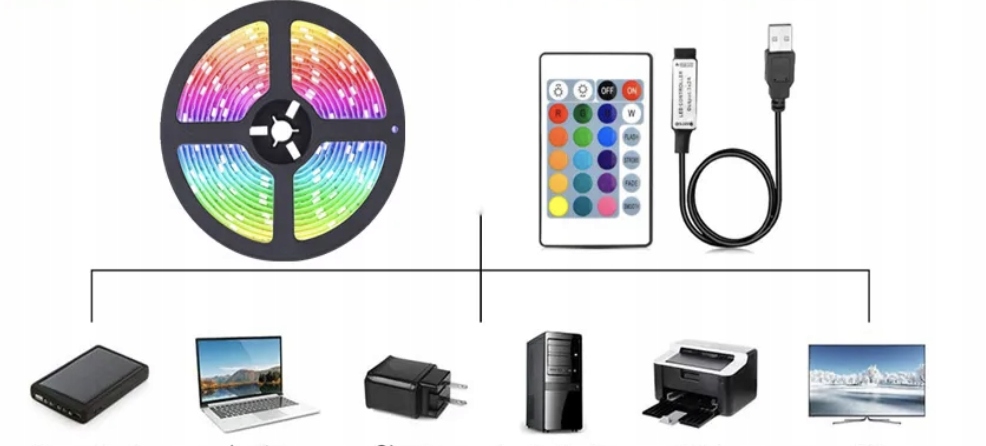 Ленту можно легко подключить к различным устройствам с USB-входом, например: