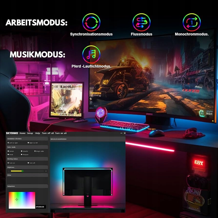 Просто подключите светодиодную ленту к компьютеру через USB. Скачав бесплатное программное обеспечение SkyDimo, вы сразу сможете использовать его полный функционал. Управление происходит быстро и интуитивно понятно.