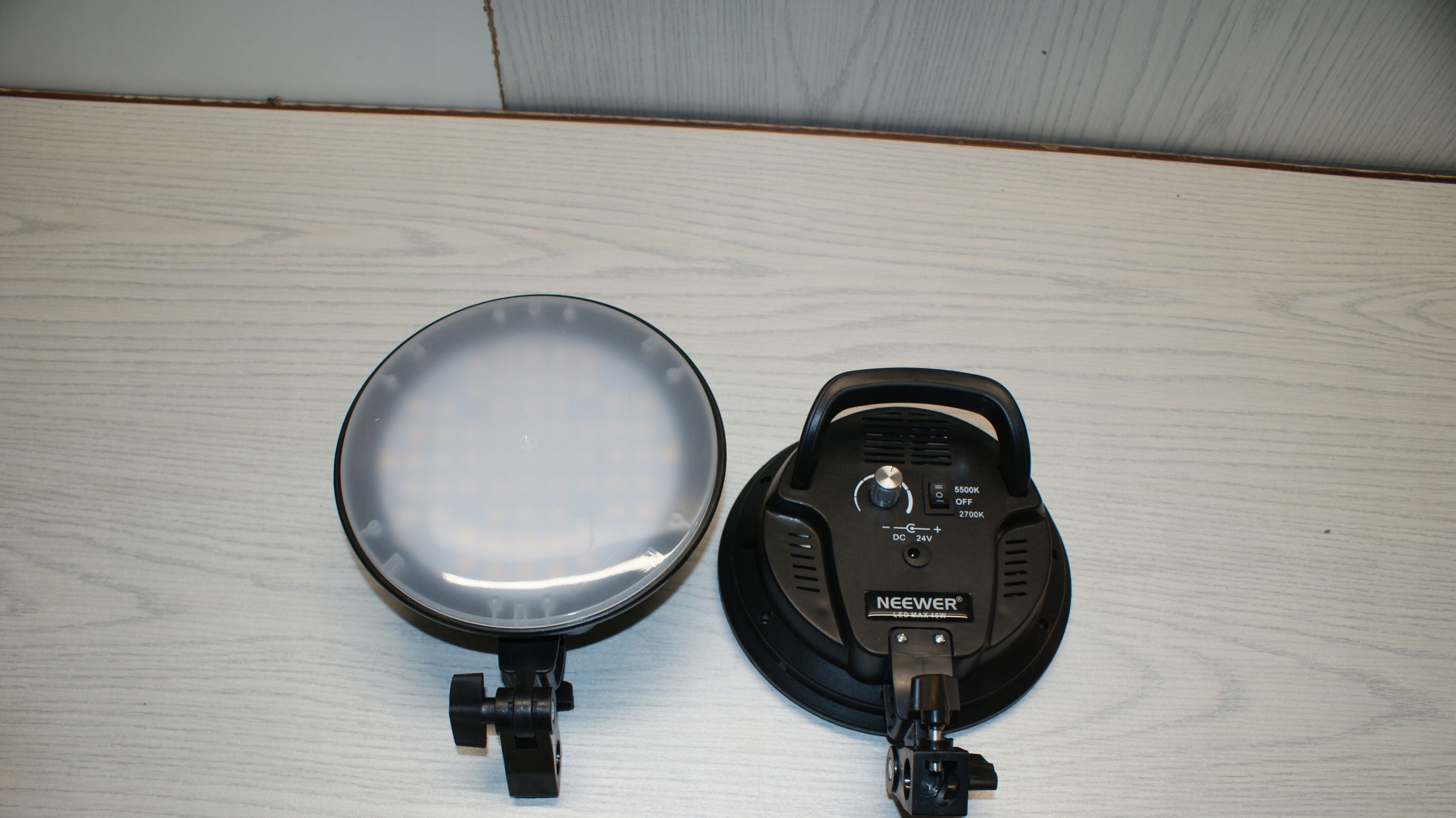двухцветная диматическая светодиодная головка 45 Вт: 45W Светодиодные лампы с 2 цветовыми температурами (2700K и 5500K); Яркость (от 1% до 100%) может быть легко отрегулирована с помощью задней ручки; Вентилятор -в светодиодном охлаждающем головном вентиляторе головки улучшает рассеивание тепла во время эксплуатации, что увеличивает срок службы лампы.