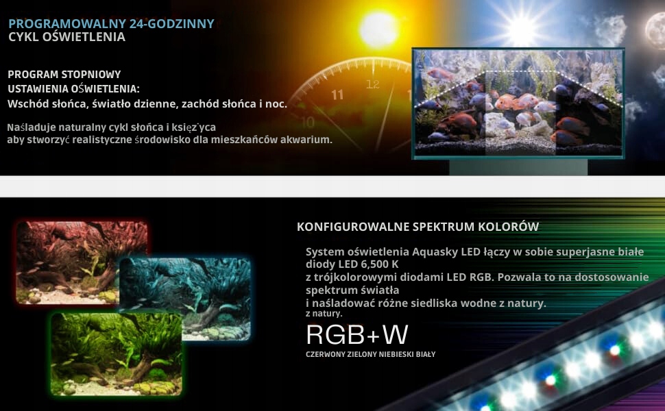 - Светодиодная система освещения Aquasky сочетает в себе сверхяркие белые светодиоды и трехцветные светодиоды RGB.