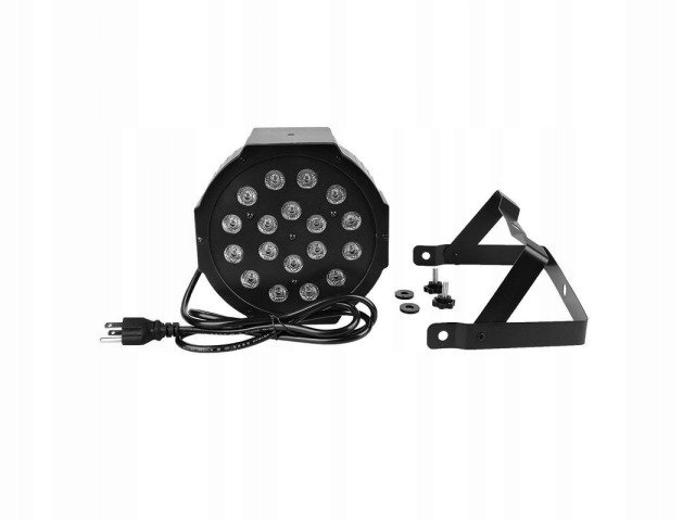 - Фара типа Par-Type, оснащенная 18 линзами, которая включает в себя формирование прочных и выразительных цветов, 3-ваттные светодиоды, работающие в цветовой палитре RGB. Устройство имеет встроенную панель управления, состоящую из светодиодного дисплея и 4 кнопок. С помощью его помощи мы можем выбрать один из четырех режимов работы, представляющих интерес для нас: