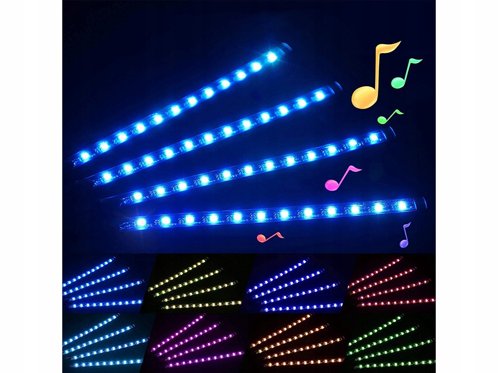 светодиодные полосы с регулируемой яркостью и цветами, идеально подходящими , будут вписаться в цвета внутренней части каждого автомобиля . У них есть возможность выбирать 8 сплошных цветов, 4 режимов прыжка и 4 режима освещения в ритм музыки . Светодиоды являются водонепроницаемыми , так что мы не промокаем их, садясь в машину в дождливые дни.