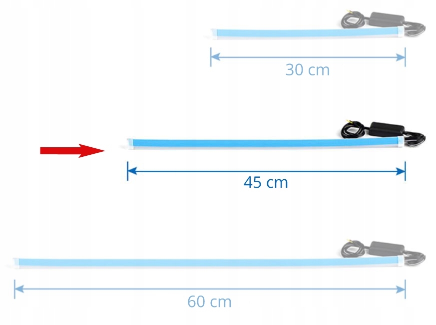 Эти светильники доступны в трех вариантах длины: 30 см, 45 см и 60 см. Если вас интересует другая длина, ознакомьтесь с другими нашими предложениями.