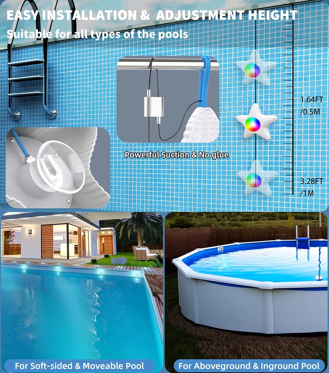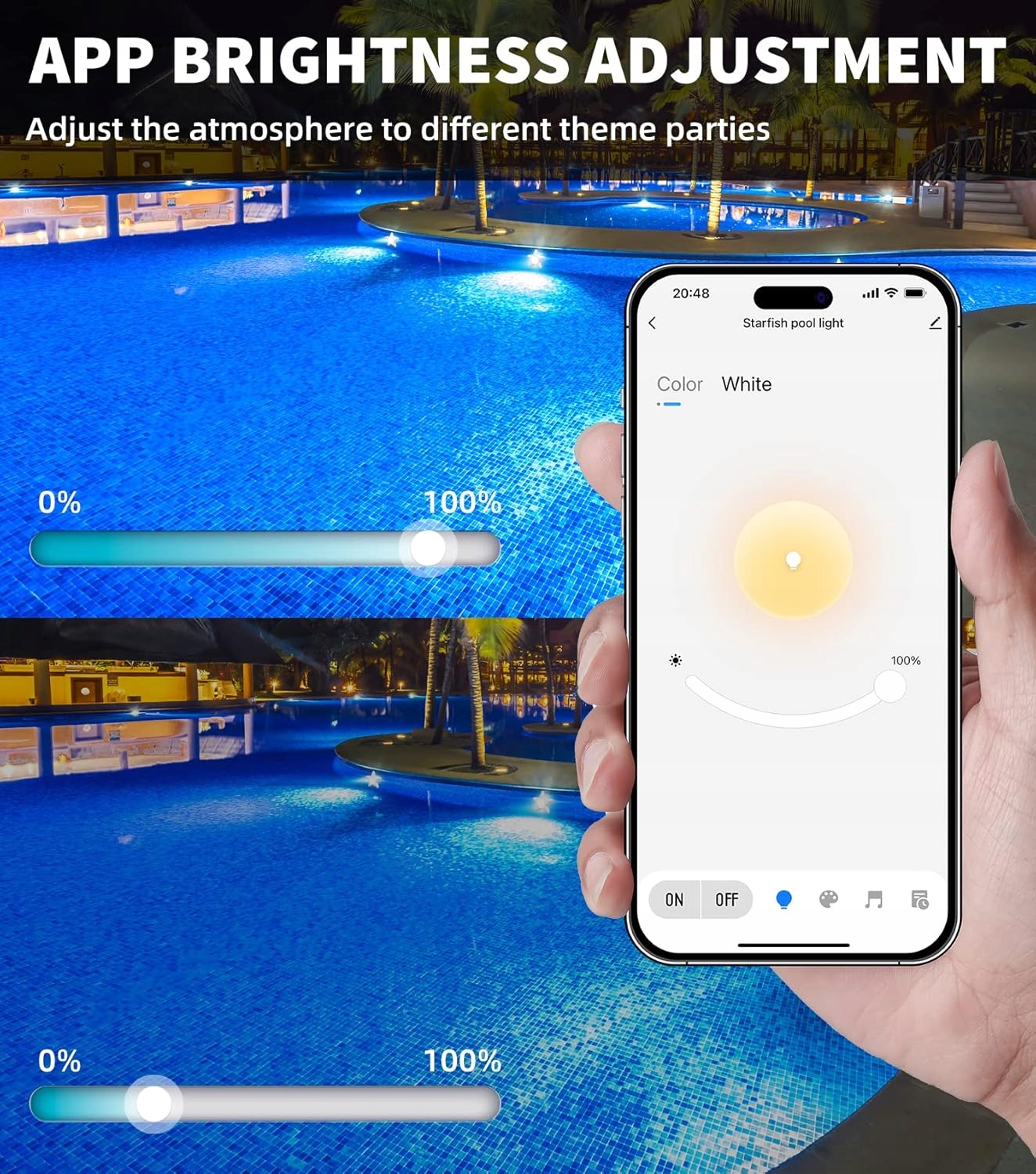 - Удобное светодиодное приложение Smart Control для бассейна, более длинный сигнал, чем ИК/РЧ-пульт дистанционного управления, скажите, что вы удовлетворены традиционным пультом дистанционного управления. Просто зажгите освещение в бассейне и присоединитесь к красочной вечеринке у бассейна.