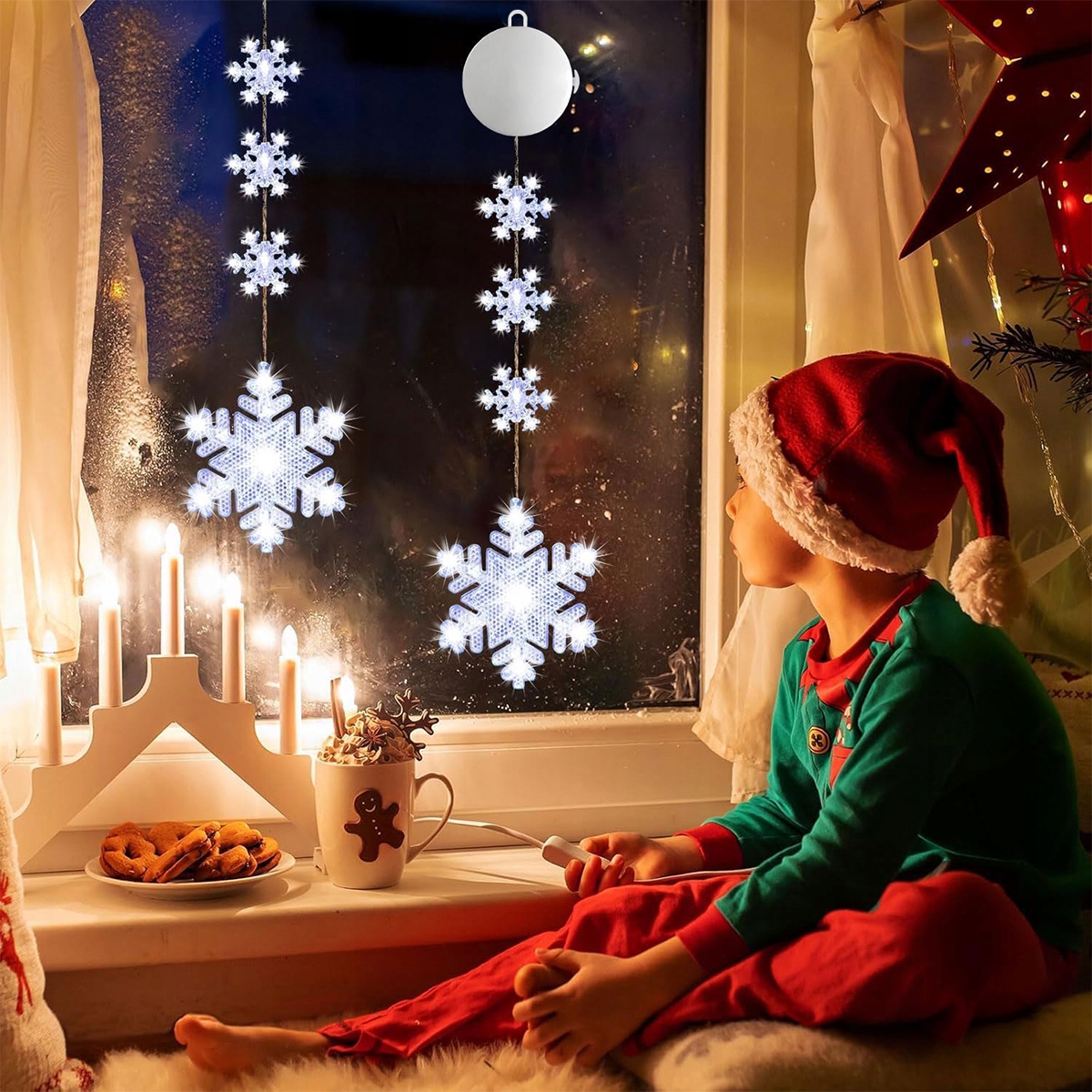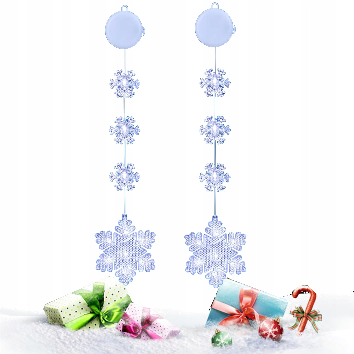 Это оконное украшение в форме снежинки состоит из большой снежинки и трех маленьких снежинок, включая 10 холодных белых светодиодных лампочек, каждая нить имеет прочную присоску и клейкий крючок, их можно легко повесить на любую гладкую поверхность.
