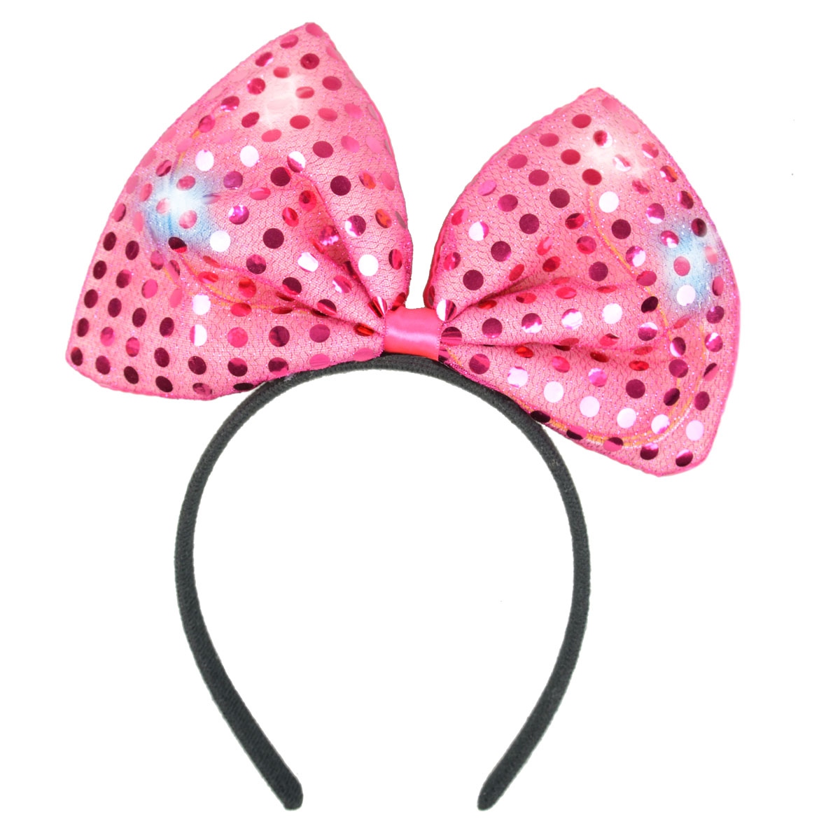 На повязке светодиодный бантик с пайетками. Питание – 3 таблеточные батарейки AG10, в комплект не входят. Размер: 20 см. 1 шт.
