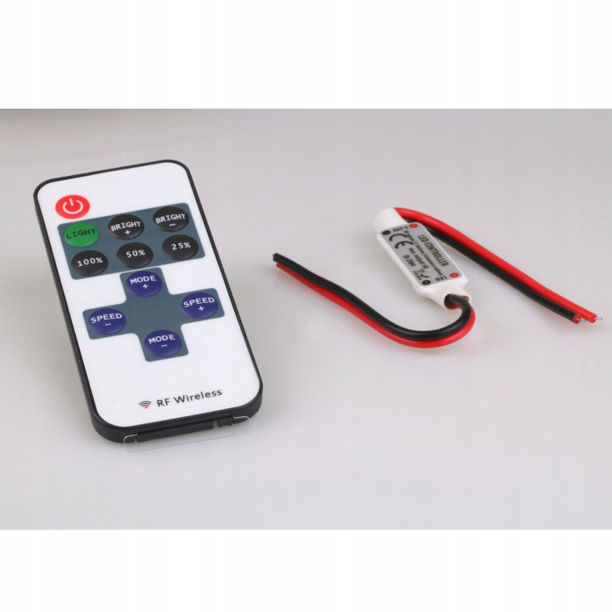 Связь между контроллером и пультом дистанционного управления осуществляется с помощью радиочастотных волн. Контроллер управляется с помощью беспроводного радиочастотного пульта дистанционного управления и имеет провода для пайки или разъемы постоянного тока.