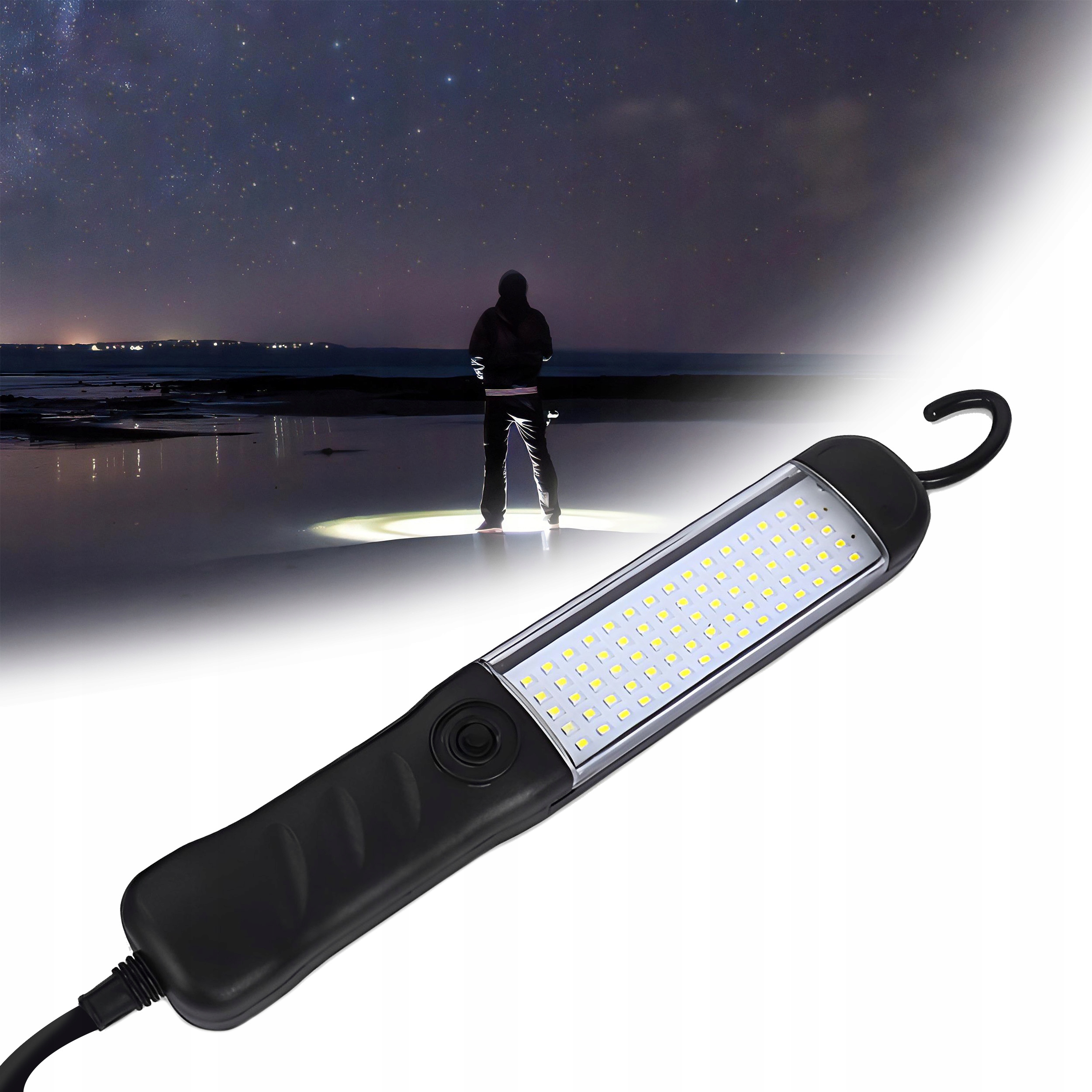 Магнит помещается в нижней части корпуса и позволяет быстро и простое и простое прикрепление лампы к различным типам стальных поверхностей. Благодаря этому мы можем комфортно и переместить лампу без каких -либо проблем и поместить ее там, где нам нужно дополнительное освещение. сложно увидеть. Вот почему такая лампа так полезна в мастерской или гараже